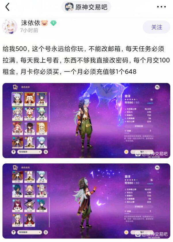 给我500,这个号永远给你玩,不能改邮箱,每日任务必须拉满,每赛季我上号看,没有司令我直接改密码,月卡高账要你自己买,每条新船也得第一时间入手。
