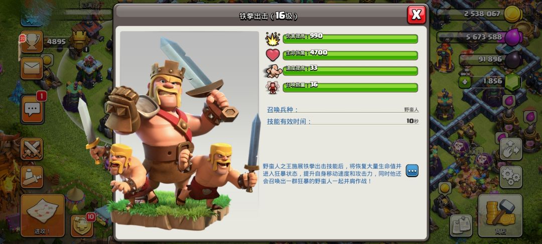 高血量配上高伤害以及狂暴之后的血量和攻击加成,15000的血量冠绝所有兵种和防御建筑。