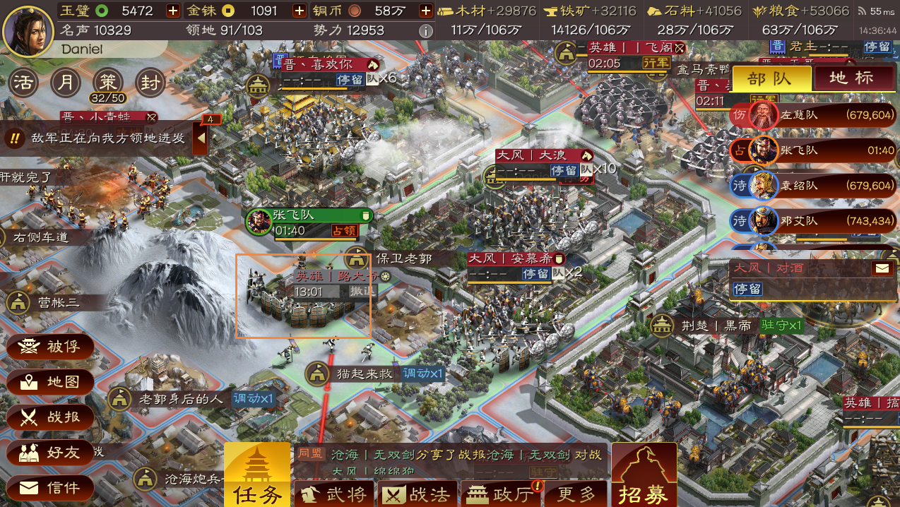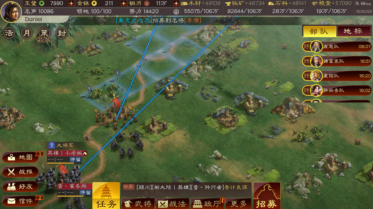 这里分享一个好办法,就是在主城利用兵力将武将快速刷到20级,然后下阵,送去分城觉醒带战法。我这里等不及了(被俘虏的我才1.2万势力值。。),也没有那么多战法点,直接满编二队刘张下阵,送去分城。赶紧征兵,种满五级地,来提升自己的资源。(我这真的是前线中的前线了,期间反复俘虏肯定是必然的)