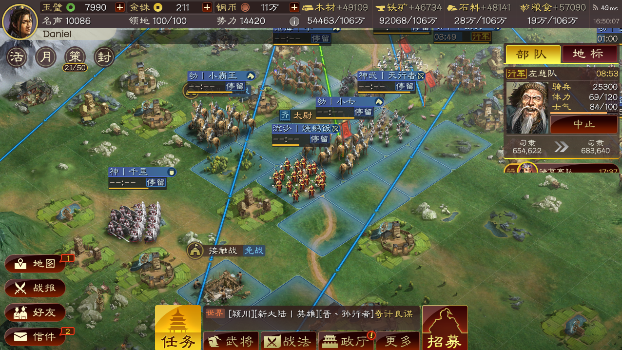 这时候,咱们的策书,就不要全部拿来屯田了,准备留着造营帐了。这个阶段,看起来打架很亏,不如种地,实际不然。因为从开荒到现在,咱们的土地已经有一定数量了,再打地,对资源的提升比较有限,而用战功从商店里换来的资源却是巨量的,同时也顺应了同盟需求。