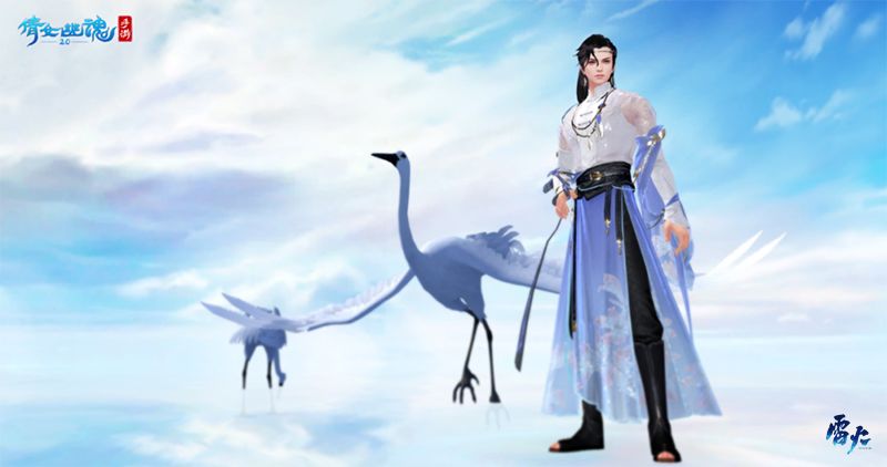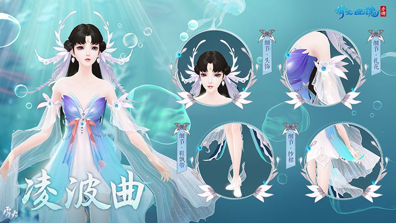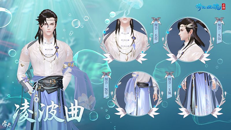 男款时装不同于女装的轻盈娇俏,整体呈现贵气公子风格。男款时装上身后兼具高贵与洒脱不羁的气质,令人怦然心动。男款时装的上装部分,在白色的内衬之外覆盖了一层薄如蝉翼的纱,勾勒出角色身体的轮廓;胸前的项链和手臂上的丝带将上半身视觉效果单调的问题完美规避;而在下半身的部分则使用了传统的长裤搭配薄纱裙摆的设计,并在蓝色的裙摆上加入了花朵元素,用以平衡色彩;最亮眼的设计为腰间部分:在上下的交接部位,采用了黑色的腰封和腰带,侧面一条突出的蓝色配饰,跳脱之余又不会喧宾夺主。男款【凌波曲】不仅实现了颜色的完美过渡,同时也将角色的身形很好地展示勾勒出来。