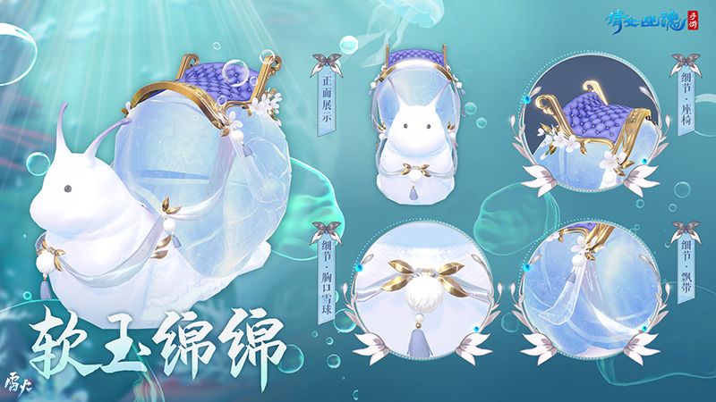 倩女手游8月全新坐骑即将于本周四与三界玩家见面。本次全新坐骑名为【软玉绵绵】,整体造型为一只通体雪白,背上背着精美玉石外壳的蜗牛。这只名为绵绵的蜗牛走起路来颇有意趣,随着玉质外壳光韵流转,头顶两根肉肉的触角不停晃动,更显绵绵灵动可爱。作为一只拥有远大梦想的蜗牛,绵绵的愿望是背着重重的壳,去往三界的每个美丽的角落。玩家可以乘坐【软玉绵绵】前往九重天,仰望星空一睹三界美景。
