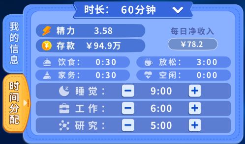 在有放松时间的同时,还有饮食所需要的时间这个就是不可避免的啦;毕竟人是铁饭是钢,一顿不吃饿得慌。与此同时,还有做家务的时间,随着住的房子越来越豪华,做家务所需的时间就会越多噢(说明生活水平大大提升啦!!!),这时候我们就需要招一名助理来帮忙做家务了哦,咱有钱肯定不做这些脏活累活啦嘿嘿,腾出更多的时间在完成拯救地球的大业!
