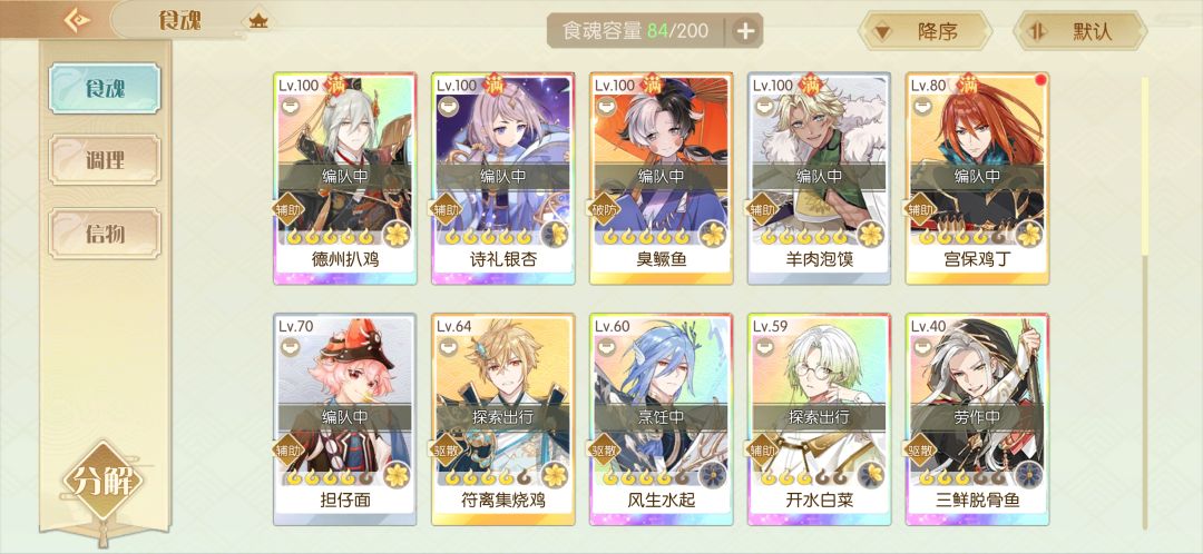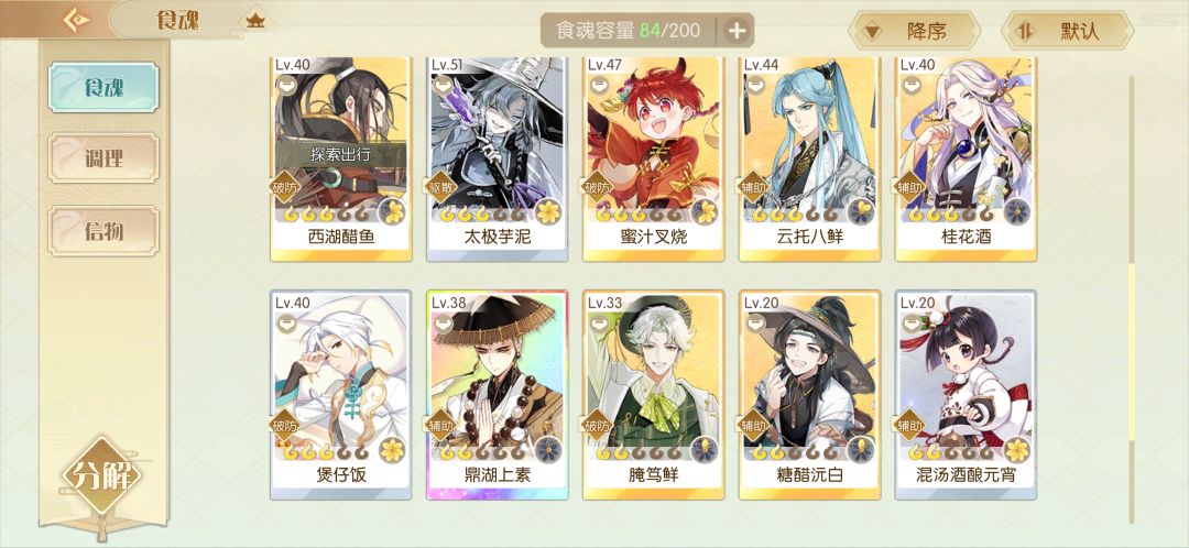 臭鳜鱼:万能辅助,和很多输出配合都有奇效,像是什么龙井啦,龙珠啦,可以带青铜,四花下除非对面有白釉否则基本就是百分百破防了,输出成型了在练,如果你练了龙井,我推荐臭鳜鱼必须一起练,开花度倒不必要太纠结,如果你能有青铜,三花挺好的,但是破防必须和输出们的大招配合好,节奏要求就大大提高了,如果没有青铜,开花度越高越好,也可以用散件堆效果命中,如果你有吉利虾,你就可以带一个臭鳜鱼,比你带三个输出的效果要更好,反正臭鳜鱼和小羊这两个辅助在后期一定会有用的,像是坤岳阁羊鱼佛龙啦,协会小羊臭鳜鱼加两个爆发啦,这两个辅助是一定会有用的,前期没资源不用着急,先放在探索队伍里混经验,等到等级满了就升一下,没有好的输出就不用刻意去给他们资源,如果你的位置缺辅助,这两个食魂是不二之选。