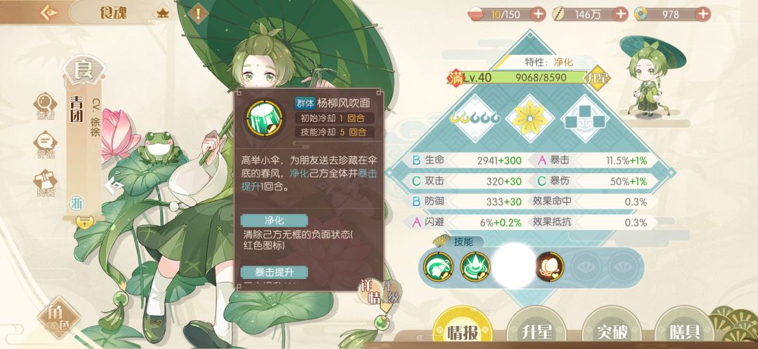曾经被称为物理外挂,加暴击很爽,算是宫保鸡丁的下下位替代吧,但是终究是个良,面板太差了,我也见过一青团三八仙靠暴击打膳具的,但那三个八仙基本都是100级的,有时候打那个联机还是挺爽的,有八仙没德州可以考虑一下蛋老板或者青团打一下联机(啥也没有只能考虑一下黑科技)前期获取难度低,大招净化在谦风阁有奇效,配合松鼠鳜鱼挺好用的,在一奶妈两输出缺一个辅助位的情况下可以考虑,但是如果你的两个输出不是非常优秀的话,还是考虑两奶妈两输出比较稳妥。不需要把等级练得太高,三四星就差不多了,因为我在后期的厨艺大赛和活动boss没有看见过青团,所以后期会被取代,我打珍馐盛宴到了两百多层,青团四十级加上膳具已经足够用了(所以膳具很重要啊,流水的食魂铁打的膳具)不需要给太多资源,放在探索队伍里蹭经验。