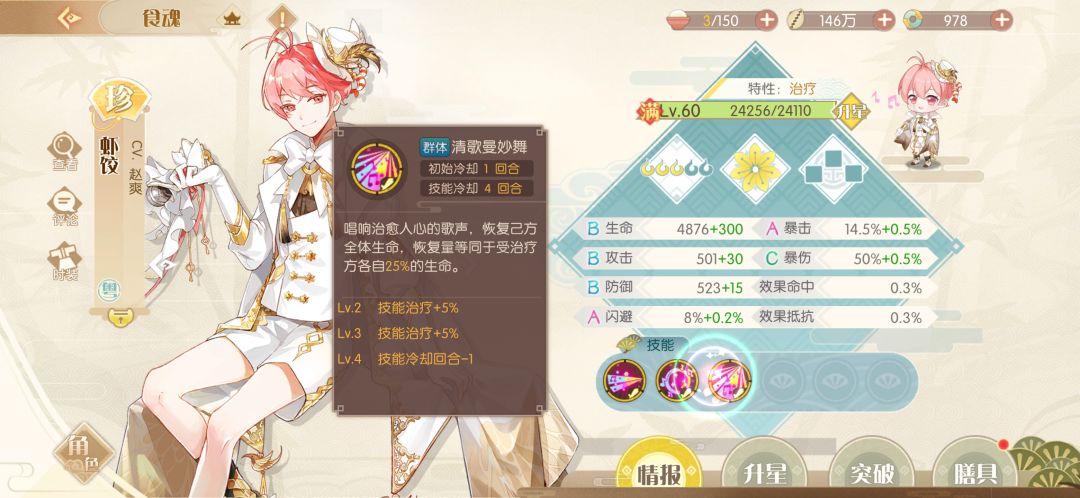 加血量也还可以啦,二技能驱散也不像诗老师那么演,算得上是诗老师的下位替代吧,虽然自身血量没有诗老师多,但是四花后回血还是能够超过诗老师,霸王别姬的出现,让诗老师的净化有一点尴尬,这时候虾饺就要闪亮登场啦,回血多,能驱散,困难3-4就可以刷到,如果你有霸王别姬,但是没有吉利虾,请爱上虾饺