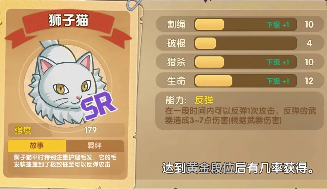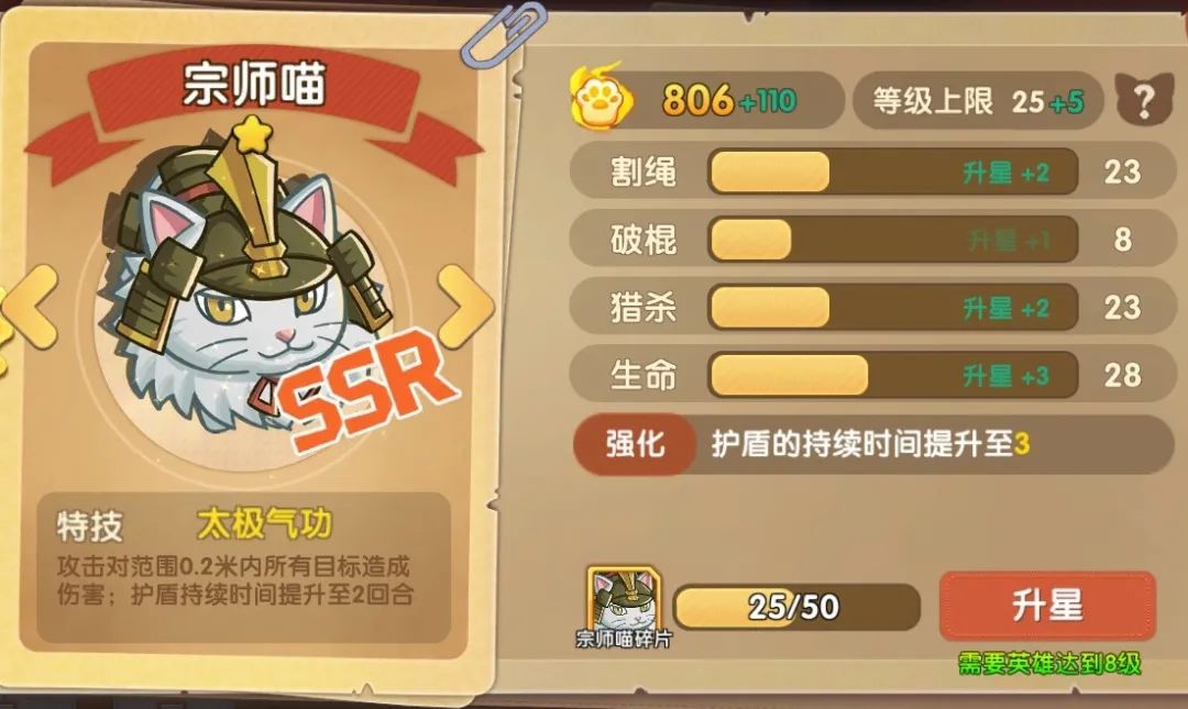 他身体强壮,善用飞刀。浓密的领毛形如狮子,一身雪白的长毛仙气十足。成为了宗师喵后他习得了特技【太极气功】,这让他的安全系数大幅提升。他的反弹护盾常常让敌人无从下手、进退两难。攻守兼备的他尽管非常高冷,惜字如金,却仍是小橘身边N多喵心中的男神。