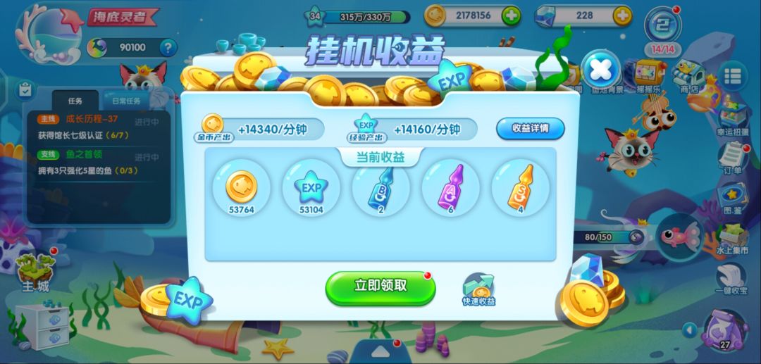 )。快速收益只能收集经验和金币,且只能收集当前所在的一个池收益。所以大家要把最大的池子放所有最高等级的鱼,然后在这个池子内快速收益。