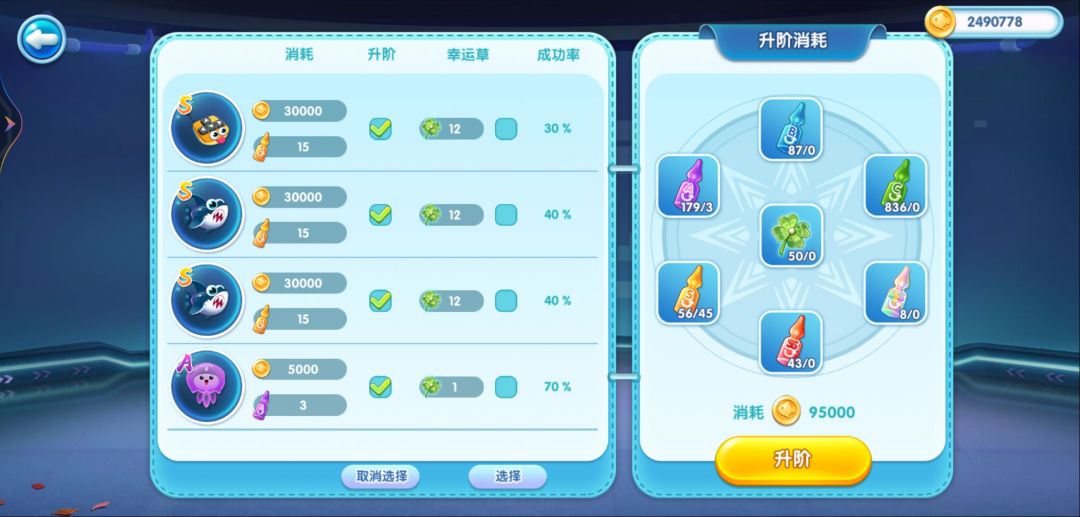 1.升阶失败会+10%成功率,最高+到50%。 这个时候用幸运草可以100%成功。