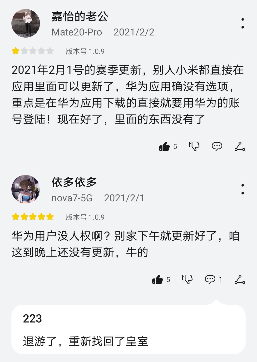 曾几何时,华为渠道版崩溃了两次,首次崩溃是在1月底,华为论坛没有提供版本更新,以至于版本过低进入不了游戏。把华为渠道的玩家直接劝退了一部分。