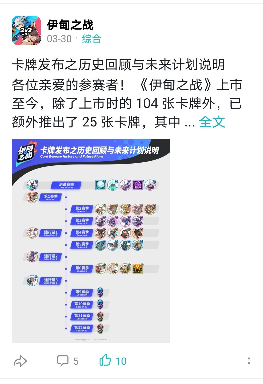 之后又展示一张对游戏历程的回顾总结图,原计划第10、11赛季各推出两张(伊甸阵营)兽族/帝国的中立卡牌,哪知临期变卦只推出了一张。看来,此游戏的策划瓶颈开始了。毕竟,每次通行证(时限是一个半月)必须推出一张英雄传说卡,每赛季(时限是一个月)还要推出兵种部队卡,在角色创作与属性构思上满费脑的。