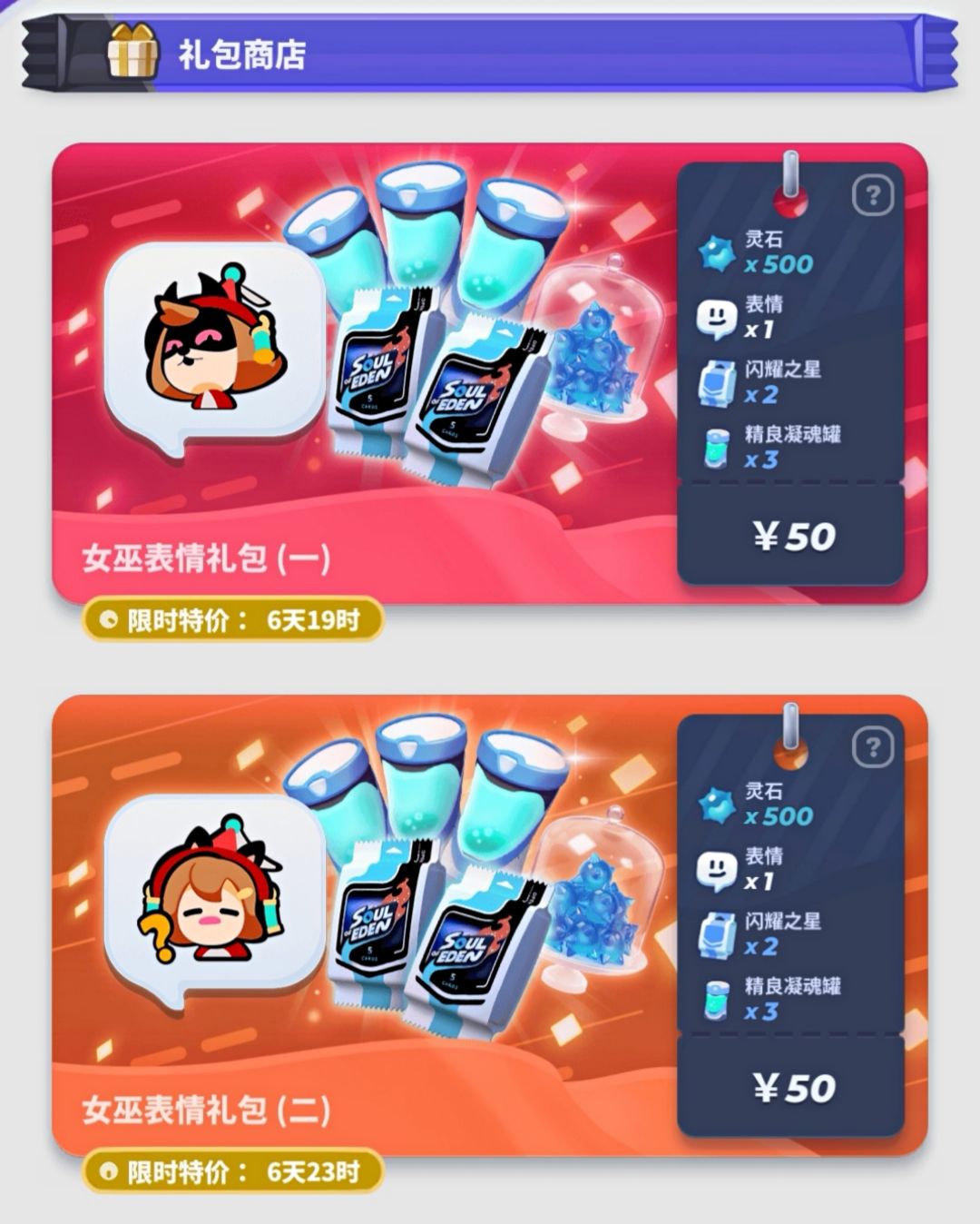 通过氪金礼包才能获取的人物表情(芙莉2个,女巫2个),现今可以通过500灵石购买。剩余的表情需要单独(50元/个)购买。以前的表情礼包的面值是128(64)元两表情,附带一些灵石与卡牌礼包。