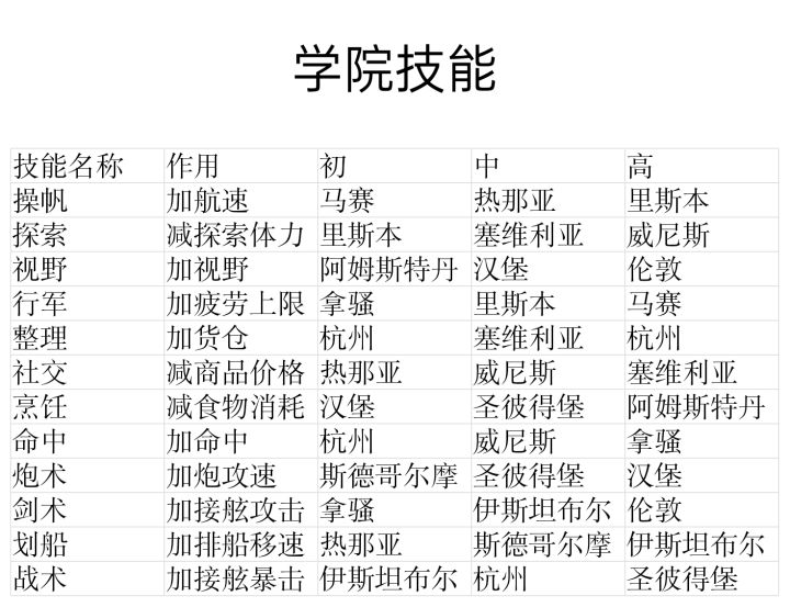 看还没有人整理,我做了个表,把学院技能的相关信息列了出来,方便查看。