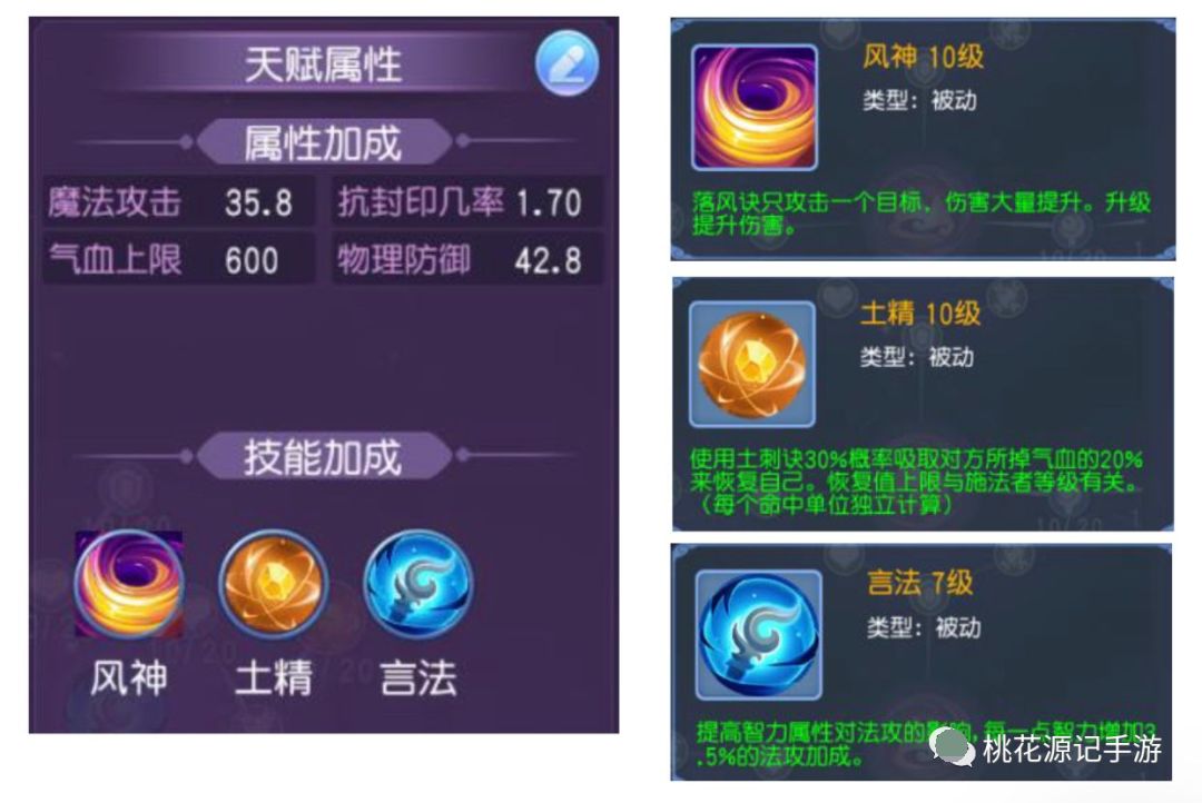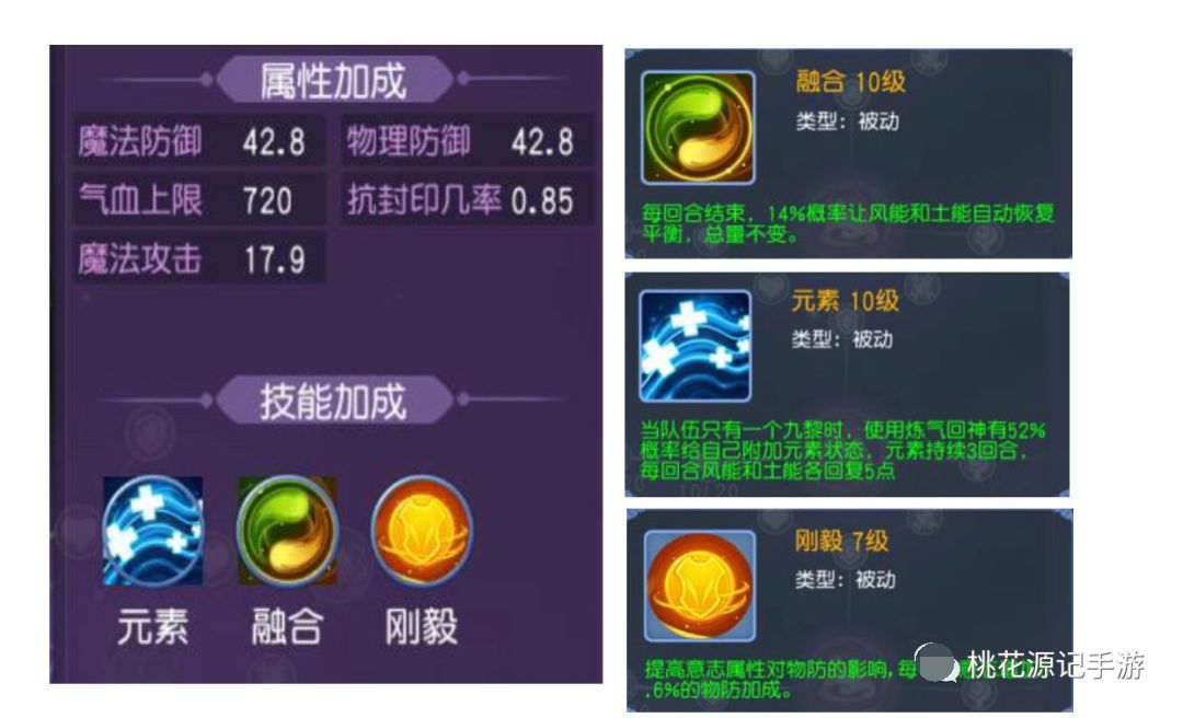 右下角天赋风神技能弥补了九黎门派天生没有单法的缺陷,土精技能增加的吸血略微增加了续航(但其实并不太实用);左下角天赋的融合的确是个神技,自动阴(tu)阳(feng)平衡有木有,但元素的蓝灯概率增加回能其实略显鸡肋。