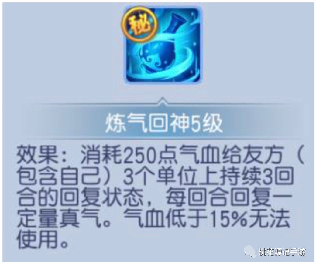 群体回蓝技能,消耗自身极少的血量,为三个友方单位持续回蓝三回合,技能回蓝数量只与门派技能等级和秘籍能级有关,我69级满秘籍账号每回合回蓝的数值为229点。