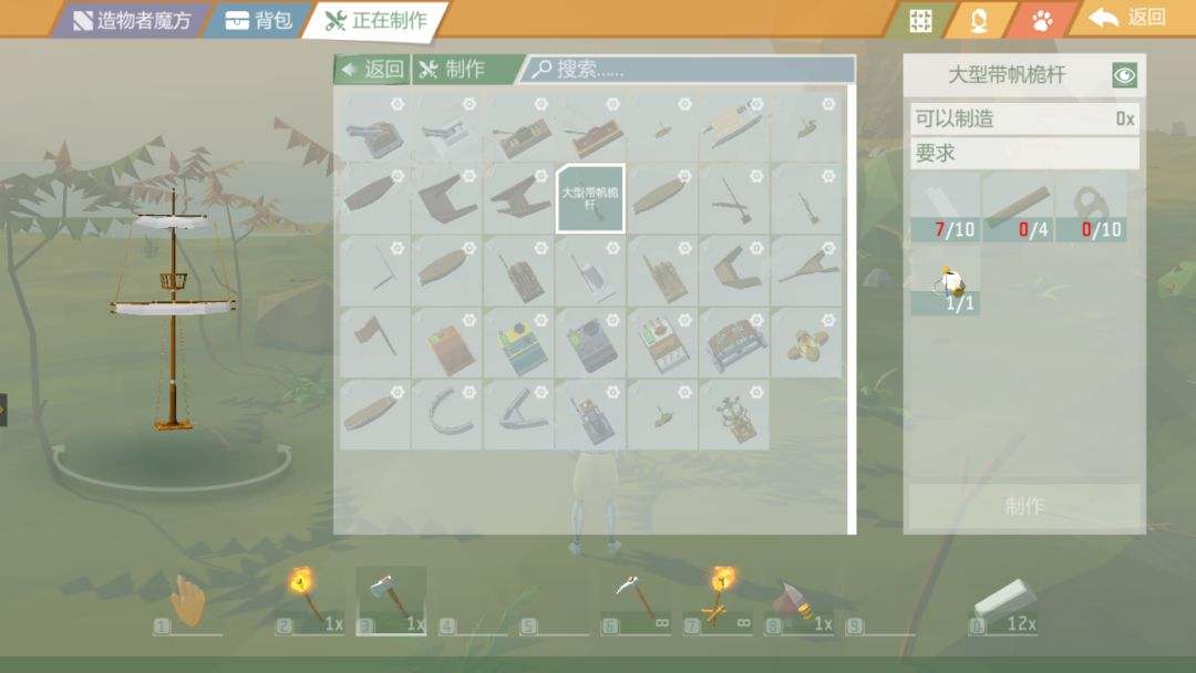 接着制作和摆放带帆桅杆。在制作桅杆时要注意,用到的材料主要是原木、任意绳子、布、裁缝工具箱。如果你在新手前期制作了纺车和裁缝工具箱,到这一步会非常轻松。