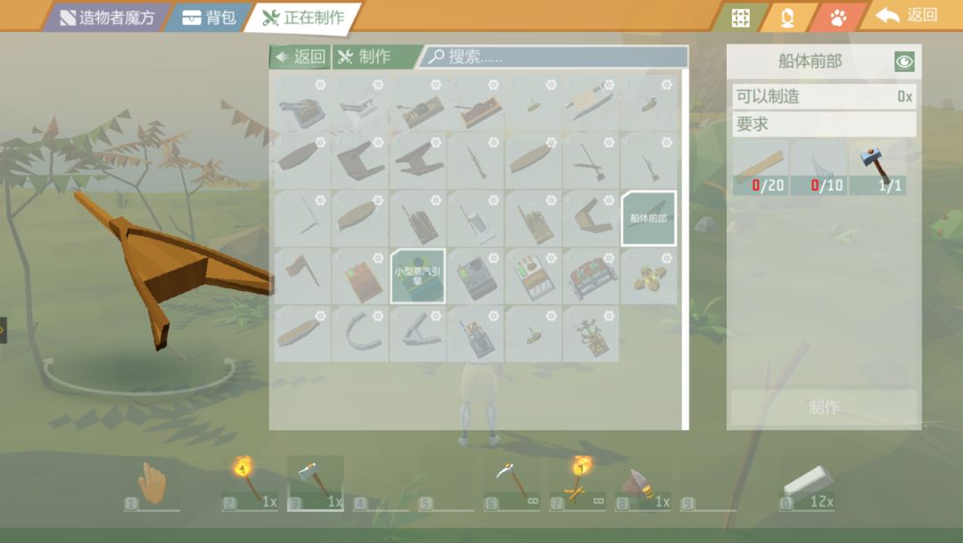 首先寻找一处空旷的海岸制作和摆放船舶,然后根据要求收集和制作木板、钉子、原木以及任意锤子和任意锯子。其中,木板、钉子和锯子在制作时需要用到锻造炉,大家可以根据材料提示自行收集材料与合成。