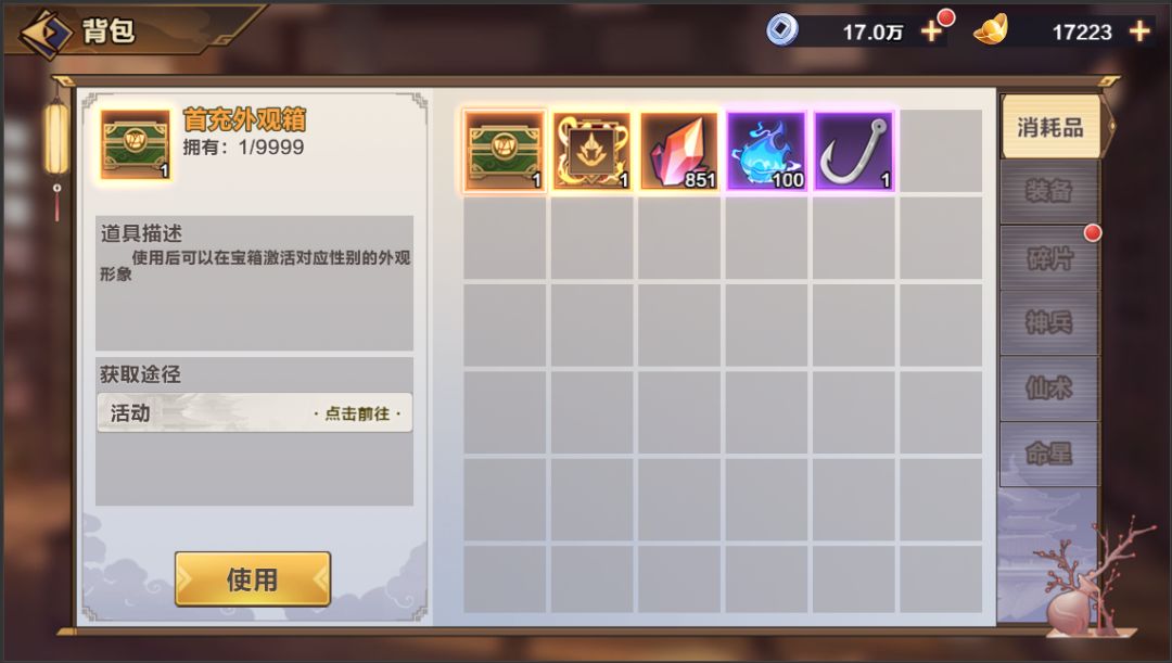 背包将会存放玩家在游戏中所有获得的道具,可以在背包中查看或者使用;背包总共共3个分类页签,消耗品、装备、碎片,选择其一即可显示对应类型的游戏道具。