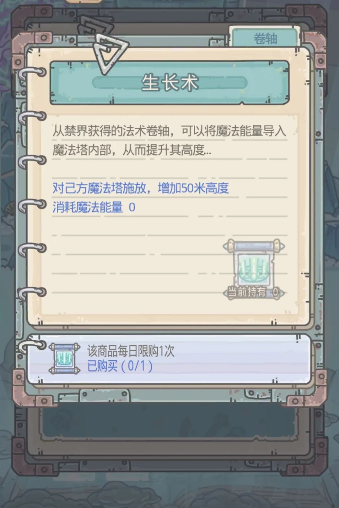 固定奖励:魔法卷轴『生长术』:使用后,增加己方魔法塔30米高度,消耗0能量