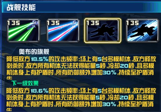 降低敌方18.5%的攻击频率;场上有5台多模机体,敌方释放必杀时,敌方所有机体无法获得能量5秒,冷却20秒,且多模机体身上有护盾时,所有防御额外增加30%,持续至护盾消失
