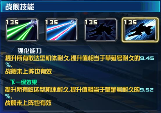 技能:【强化能力】(135级效果)提升所有敢达型机体耐久,提升值相当于草薙号耐久的9.45%,战舰未上阵也有效