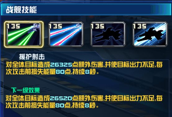 对全体目标造成26325点额外伤害并使目标出力不足,每次攻击前损失能量80点,持续8秒