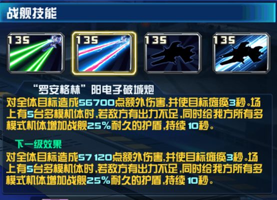 对全体目标造成56700点额外伤害,并使目标瘫痪3秒。场上有5台多模机体时,若敌方有出力不足,同时给我方所有多模式机体增加战舰25%耐久的护盾,持续10秒
