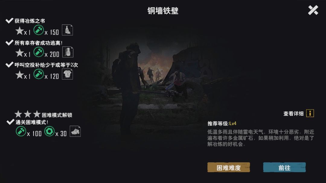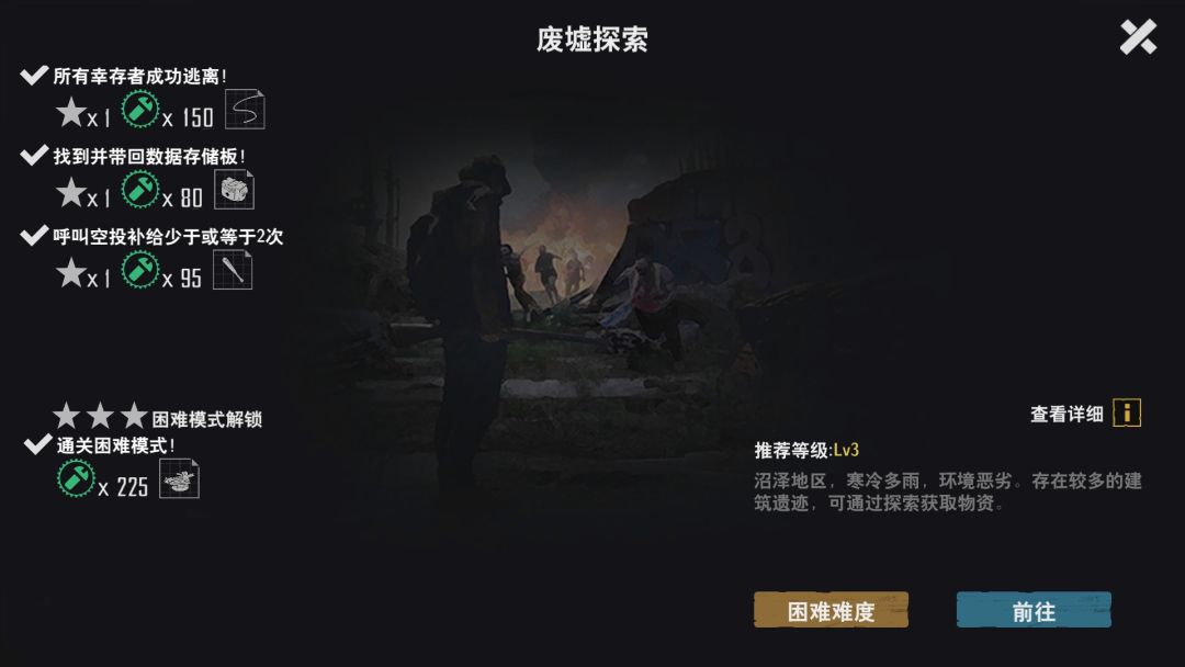 注意事项:进去不要在第一场景逗留,会一直刷新僵尸来骚扰。直接救援幸存者,然后去别的图搜索物资,最后五分钟回来修建防御工事。如果不怕麻烦,可以刷尸潮,召唤空投,但是总体收益比机场差很多。 产出资源:纯净水,罐头,食物,消炎药等,不建议刷这个图,收益低。