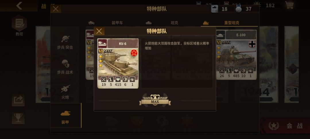 我愿称之为全游戏除了氪金武器之外的最强武器。由于本带火箭攻击大幅加强,范围伤害足足有本体伤害50%,让火箭炮从此不再刮痧。间接性的大幅增强了喀秋莎和kv 6的强度,不过范围伤害毕竟还是要进行一定的衰减的,所以刮痧的声音依旧不会消失,火箭炮单位在攻打坦克等大肉的时候依旧乏力。但是kv 6却能稳坐最强重坦的地位,这是为什么呢?首先,喀秋莎的火箭炮对于重炮来说提升的属性极为有限,只能当做一个范围输出存在,但是对于重坦来说,可不一样了。虽然目前暂时不知道这个AOE属性究竟能触发多少东西,但目前可以肯定是他可以触发坦克的被动,还有闪电战。虽然触发闪电战没什么意义而且甚至还会影响判断,不过大多数情况下不太可能会给重坦上有闪电战的将领,而且只要够细心的话,这点问题影响不大。但是另一项隐藏属性触发坦克被动那可就不一样了。这间接性让kv 6成为触发被动几率最高的坦克一般情况下,几乎是在以别人1.5倍甚至两倍的几率再触发虽然本身基础属性是三个重坦里面最低的存在,但是机动性还算可以,再加上被动技能强大的存在,让她坐实了最强重坦的地位。当然,它和氪金装备的争论还有待争议。不过无论氪不氪金,我相信kv 6都是你在通关同盟国战役中的必备精品。个人推荐,一拿到手上就应该立马动用所有资源进行升级。![[嗒啦啦2_期待]](https://img.tapimg.com/market/images/4586b6e33f74e054079a0d9aaed70aee.gif)
