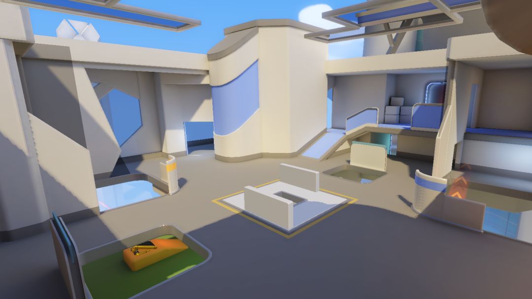 一层是大血包所在地,掩体众多,因此相对安全,适合“中场休息”。同时,一楼配有两个直通狙击点的跳板,为选手们提供了更多的策略选择。