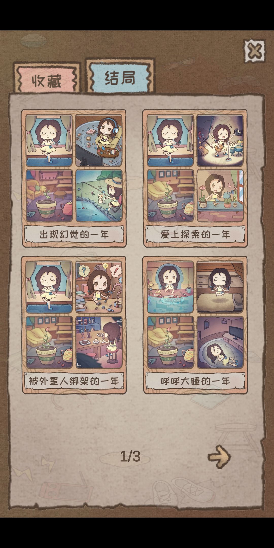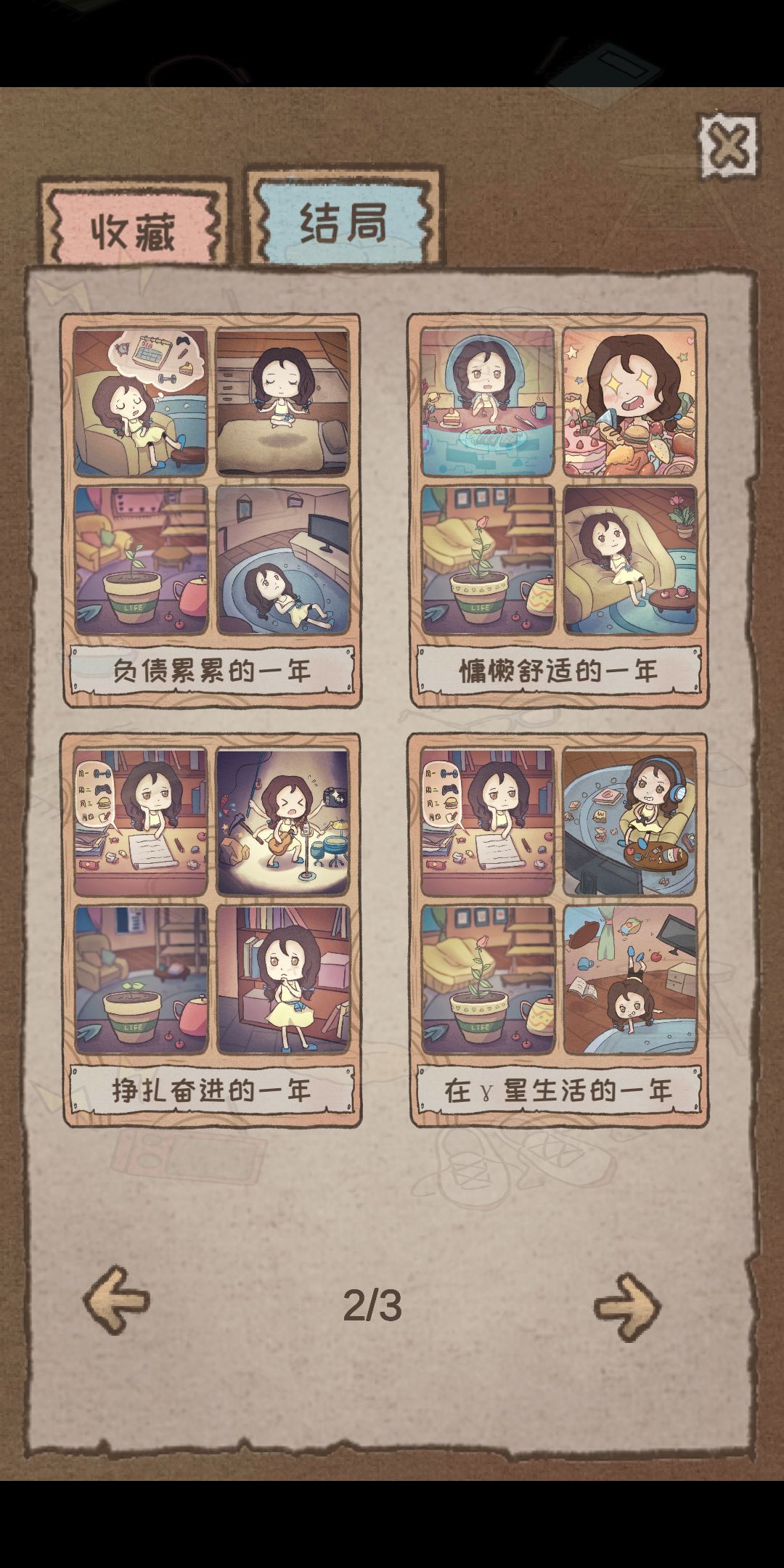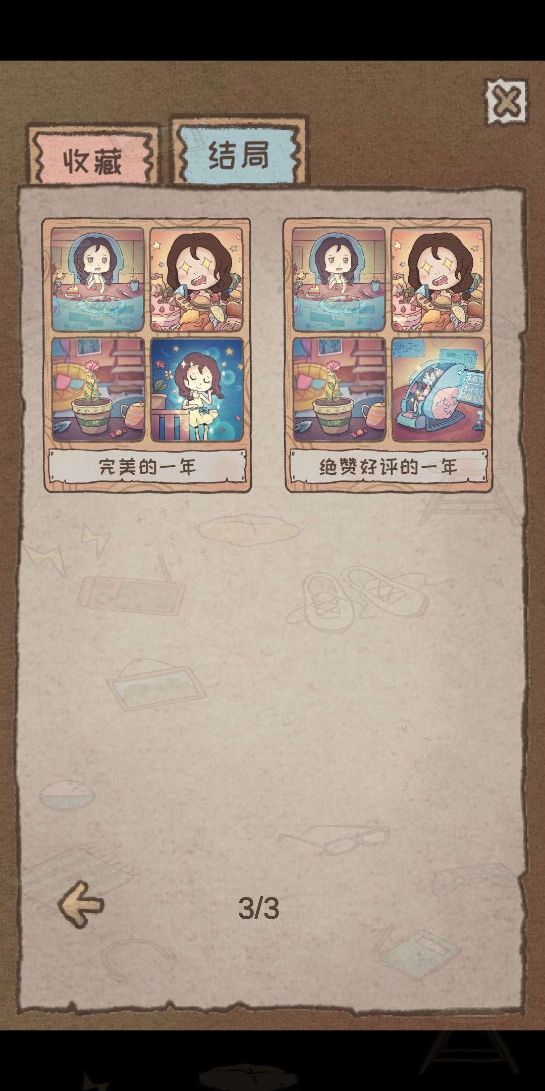 说一下比较难获得的:1.完美的一年,前几周点击厨房最后一个,让心情保持在5,后面就保持疲劳低,其他三个较高