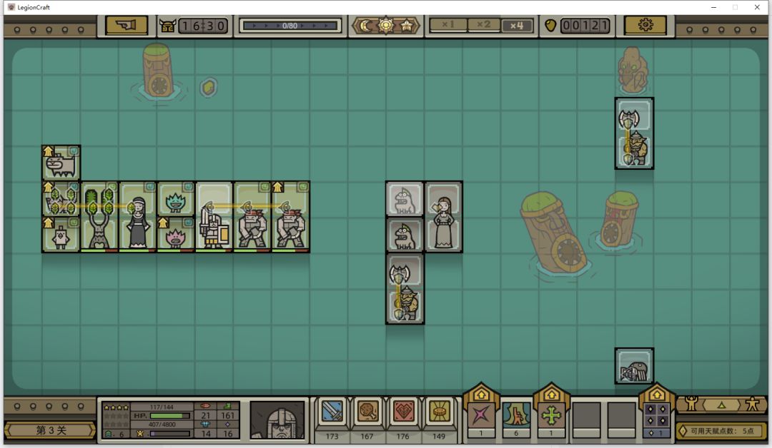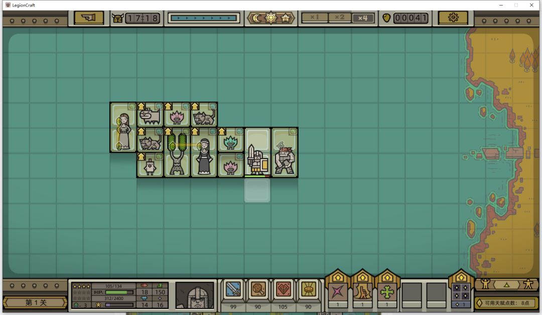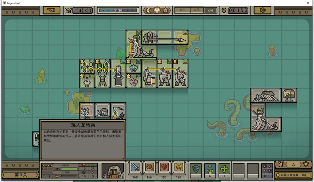 其实军团还缺一个前排,但是确实没找到合适的,就暂且由龙枪兵充当前排,他拥有铁壁技能,可以抗好多下。特别的,他比土匪生命值高,这个游戏会判定优先攻击生命值最高的单位。
