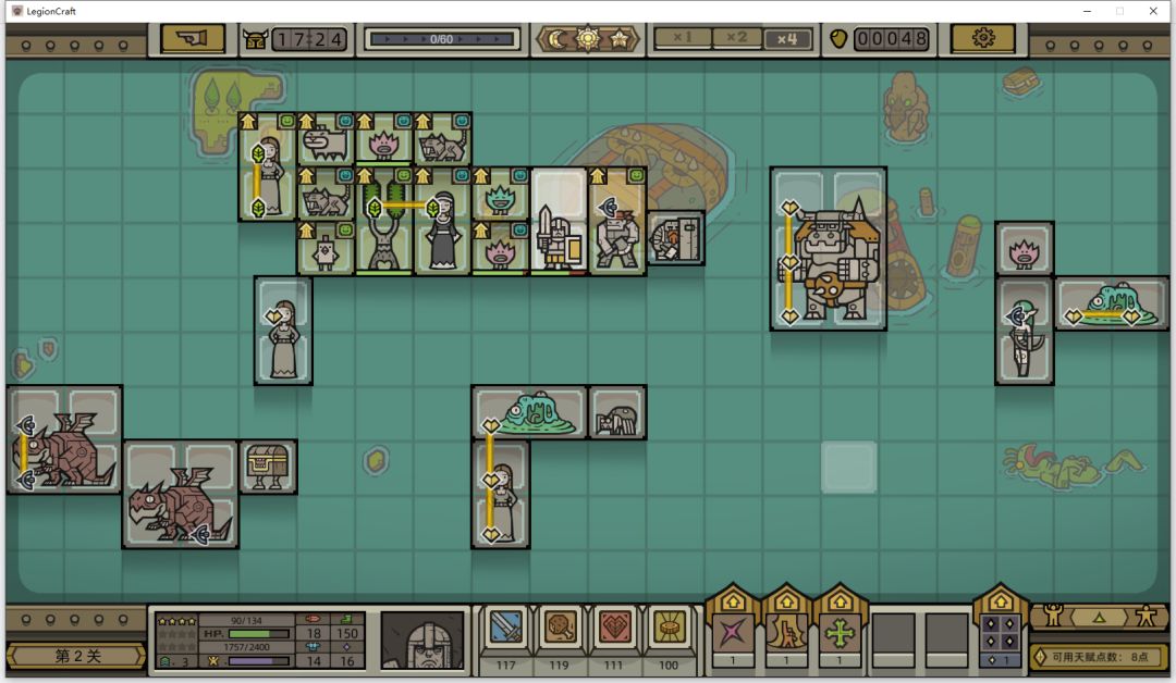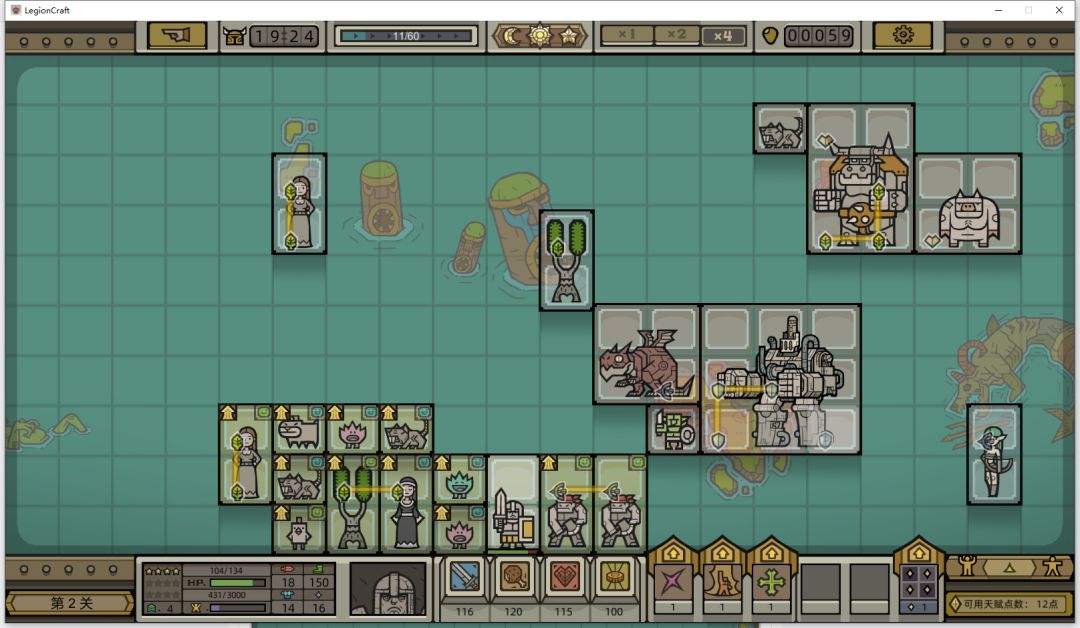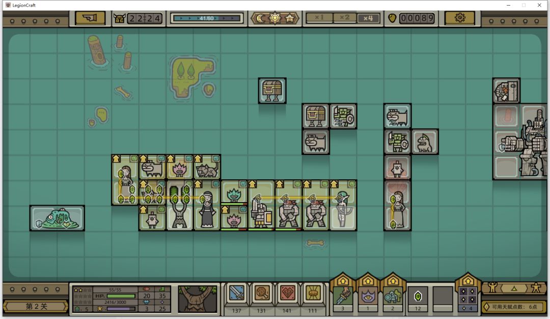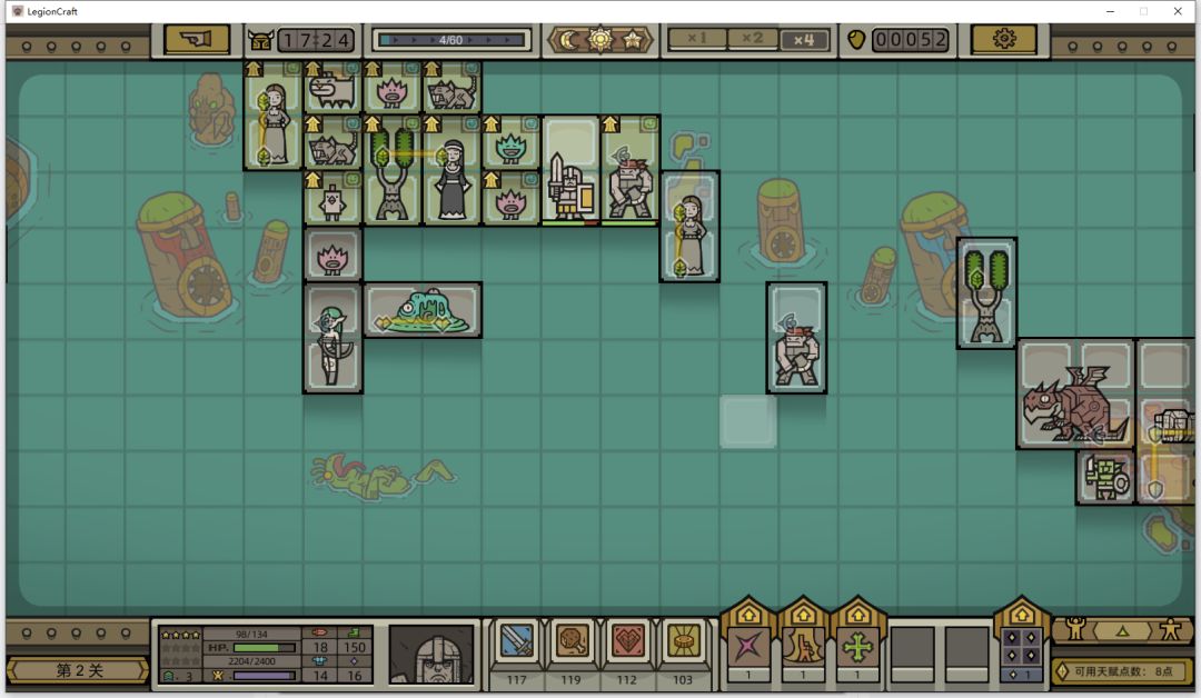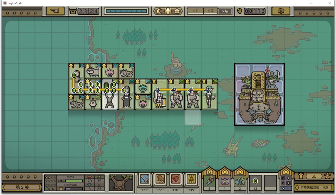 继续招募动物,然后按照惯例输出放在英雄右边,不过这一局输出单位好少,只拿到一个土匪,无所谓了,第一关boss很弱,技能都不需要点