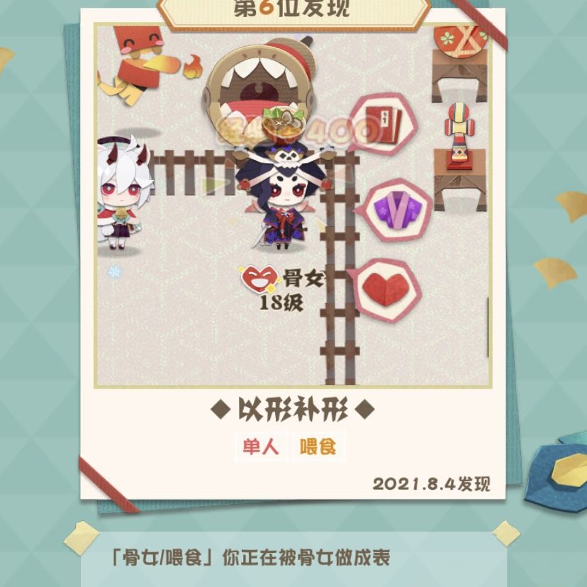 彩蛋6:「以形补形」骨女/单人/喂食,喂食骨女菌菇排骨汤概率触发,建议连点,喂一级的菌菇排骨汤。