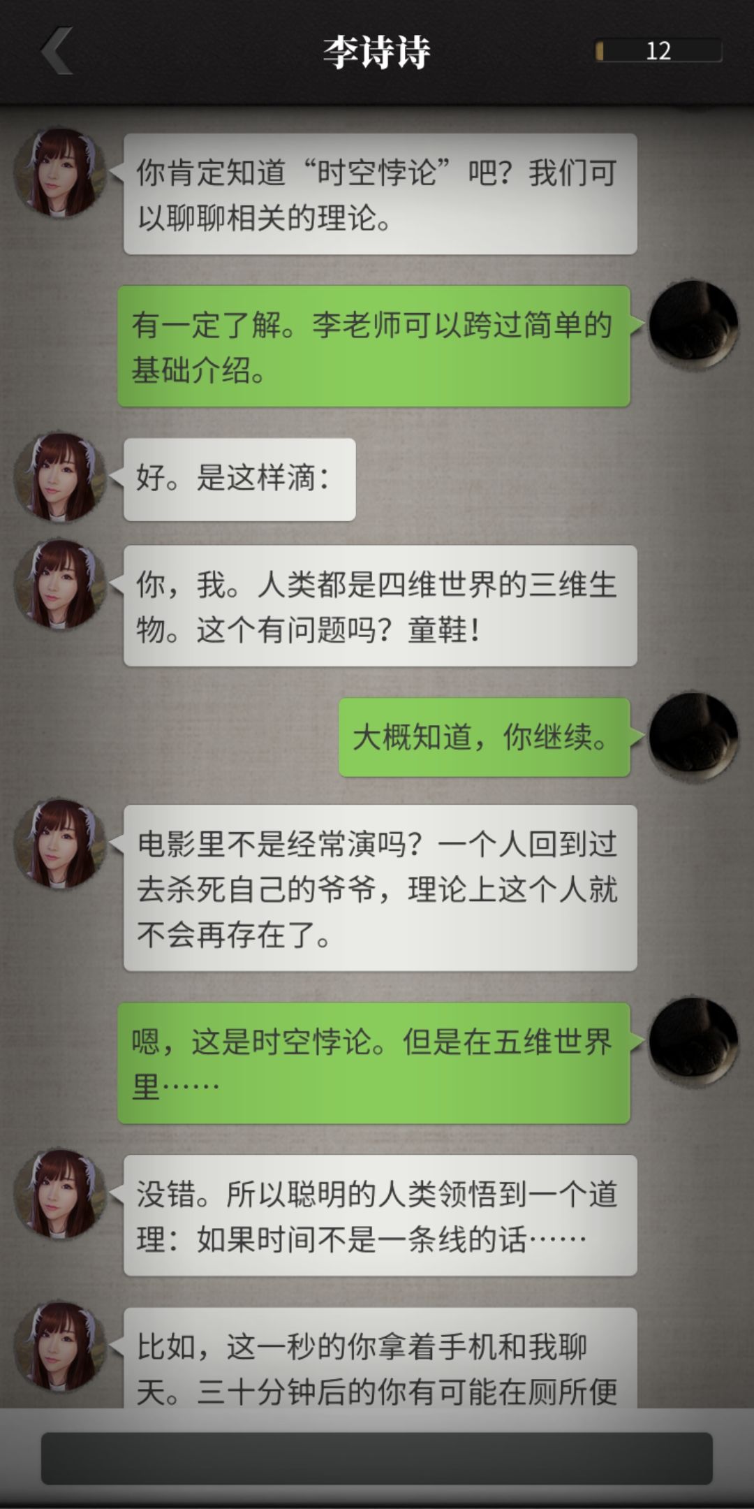 就是这里,和李诗诗扯什么三维四维,什么时间不是线性,完全是错的。我们生活的空间是几何意义上的三维,所以就算加上更多的维度也是几何意义上的四维、五维。结果李诗诗说的五维就直接是时间变成平面了……喂,不是这样加的啊??整个对话聊下来尴尬死了我还不能反驳……没有可能把这段修改一下吗,官方( •᷄ὤ•᷅)?