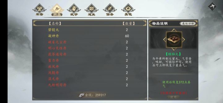 橙色品质的丹药非常有趣,一共八种,对应六识和悟性,悟性的丹药又有两种,茯苓通窍丹(悟性+5)和九转明窍丹(悟性+3)。而在武学分类(非丹药)中,又有楞珈经(悟性+3)和玄冥丹(阴属性+10),其中丹药只能自己使用,而武学可以给队友使用,是最大的区分。