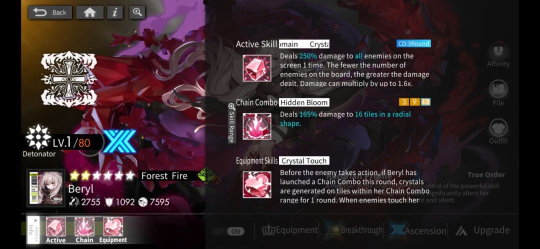 beryl在输出的时候如果不触发极光回合改变自己的站位,那么她的输出能力将会再增加血晶的伤害(40%倍率的真实伤害)也就是说一般beryl的连锁技倍率是205%,在这种情况下,beryl打2*2目标的最高伤害应该是3*205%-3*敌方防御。