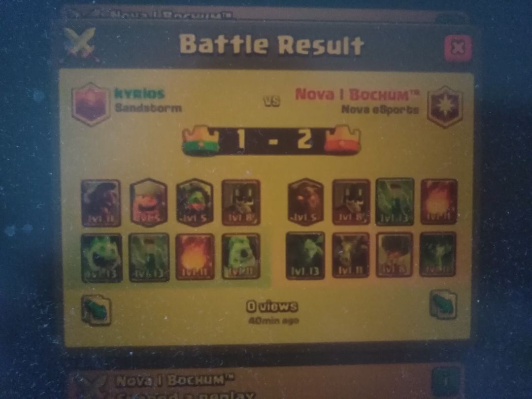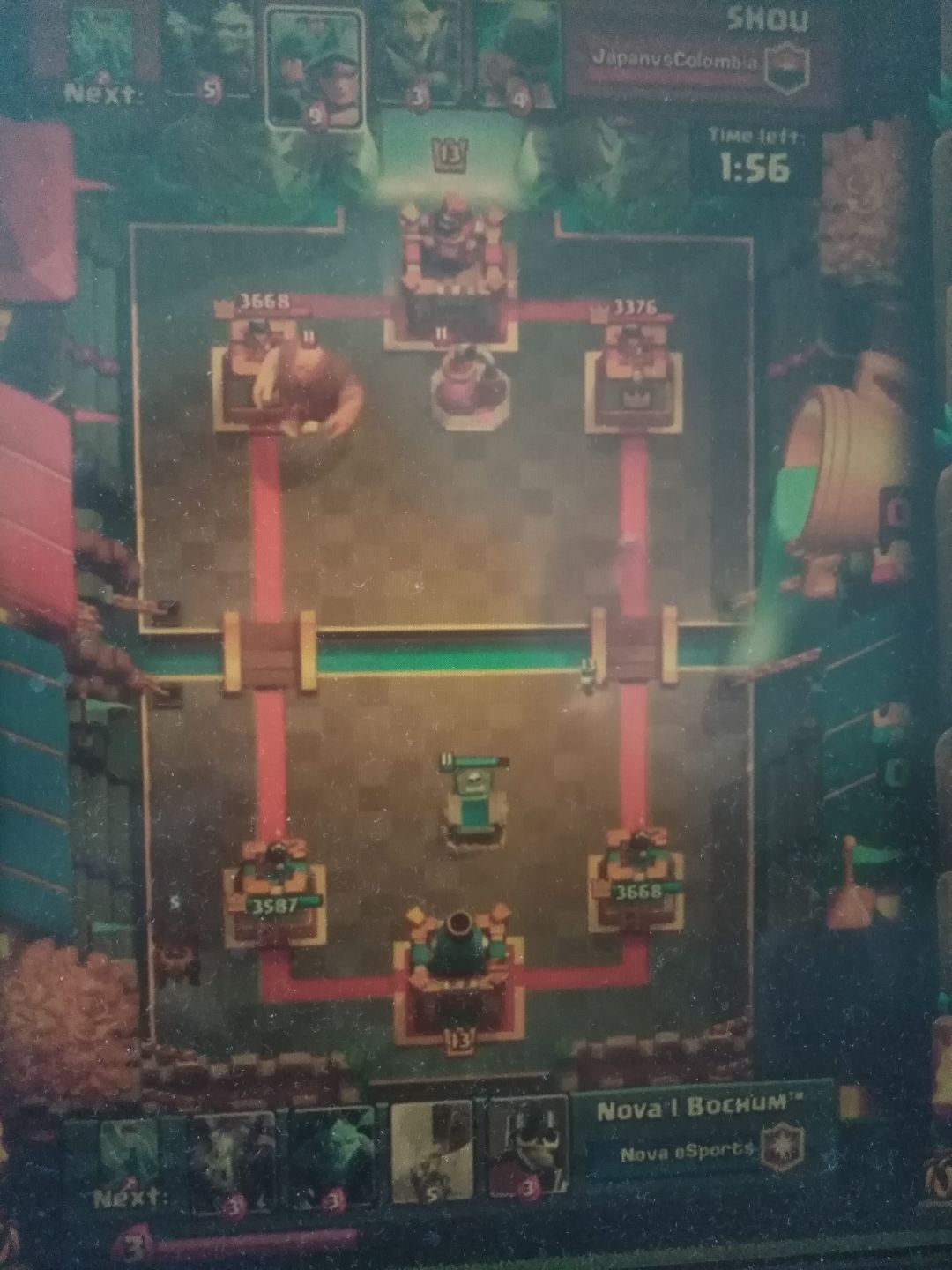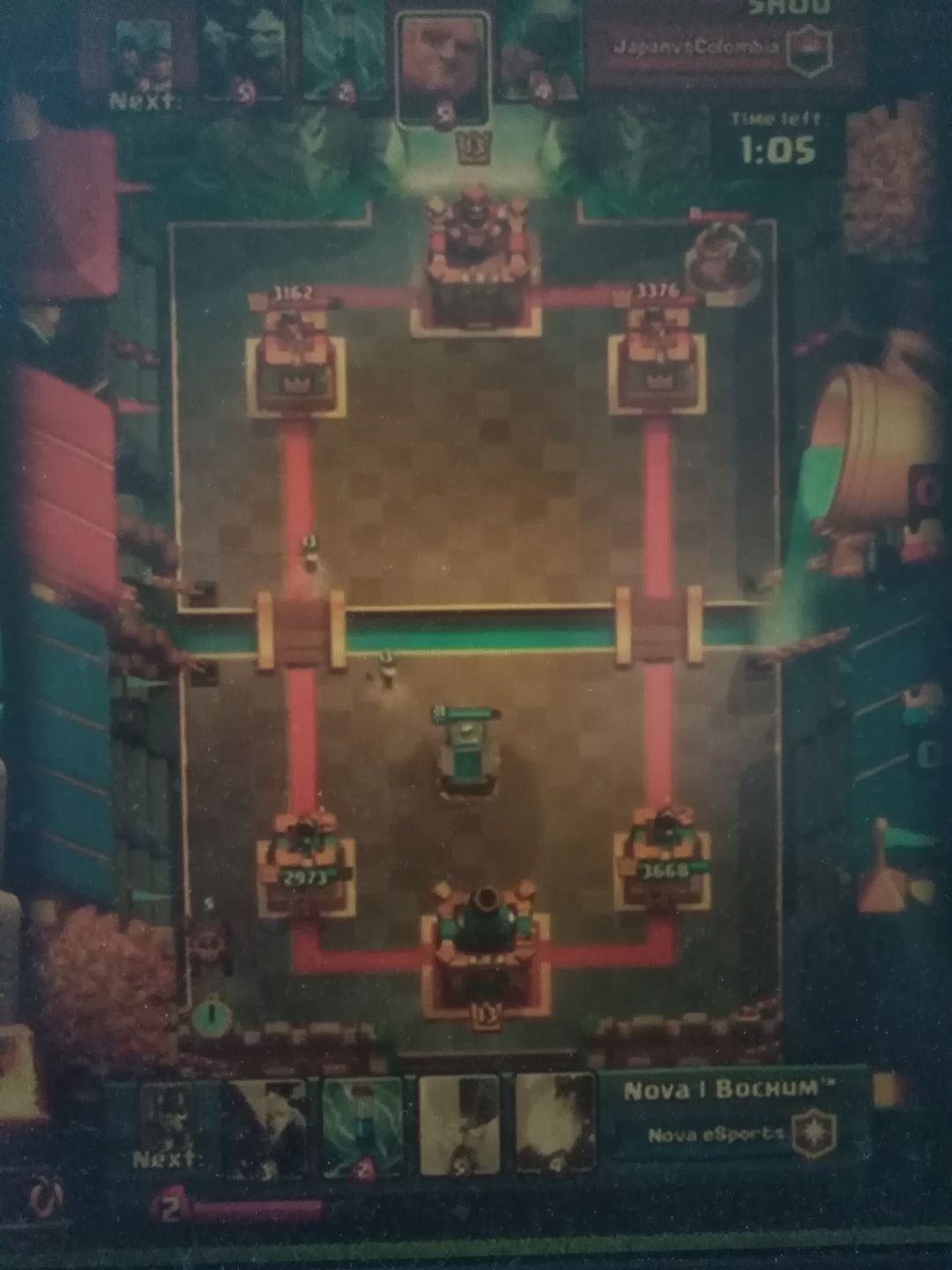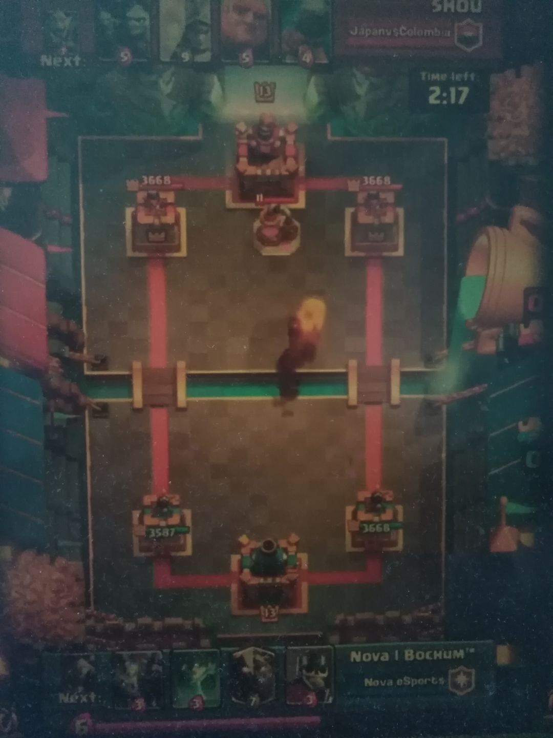 (气球砸了两下塔,虽然对方返场的樵夫破了右塔,但是对方的两座塔都岌岌可危。这里体现了记牌的重要性。对手每下出一张牌,都需要再下另外的四张牌后才能重新拿回那张牌。不需要记住对手所有的牌序,只需要记住对面关键的解牌。这里Bochum就是记住了火球和地狱龙,一波换路锁定胜局)