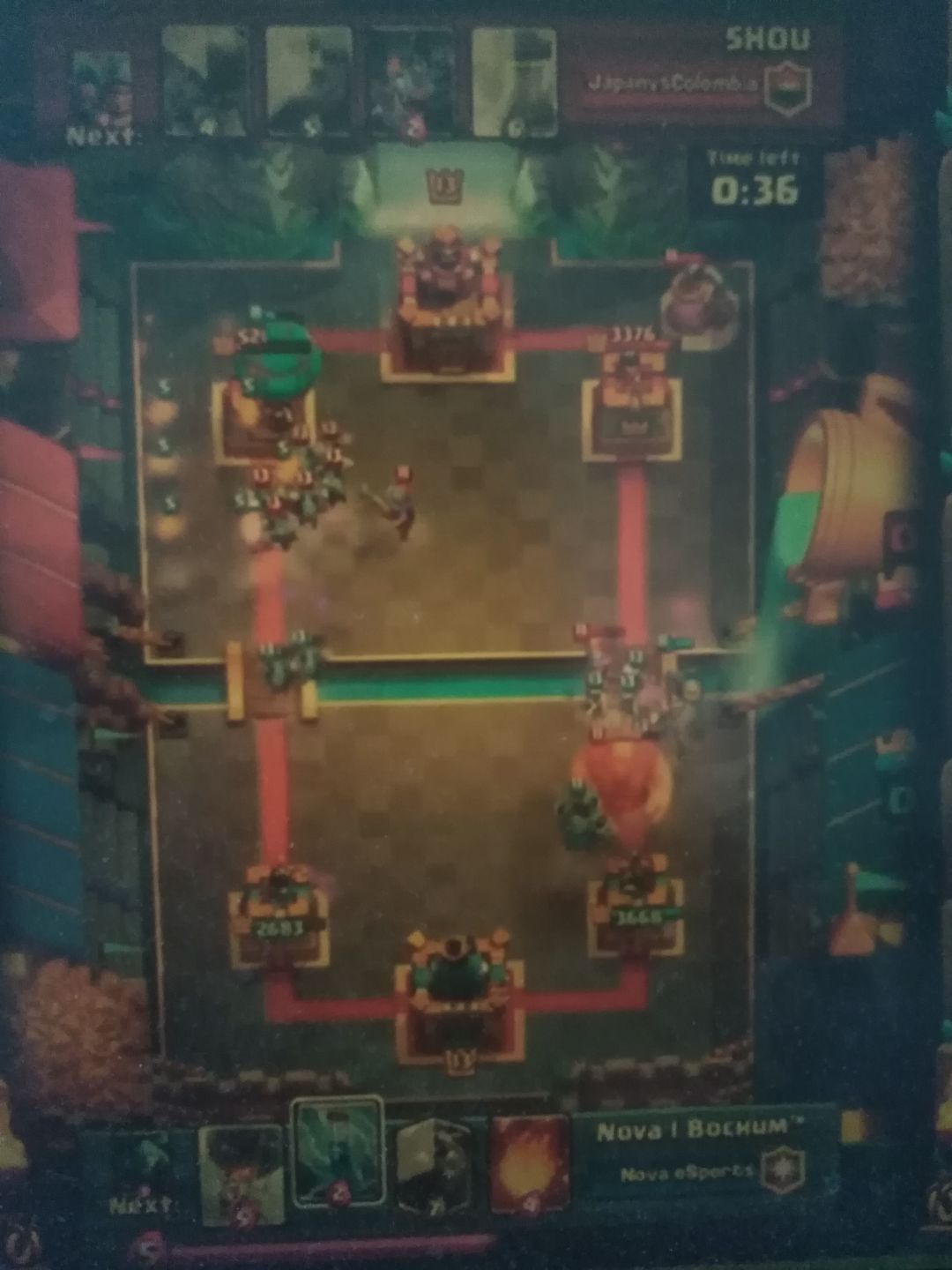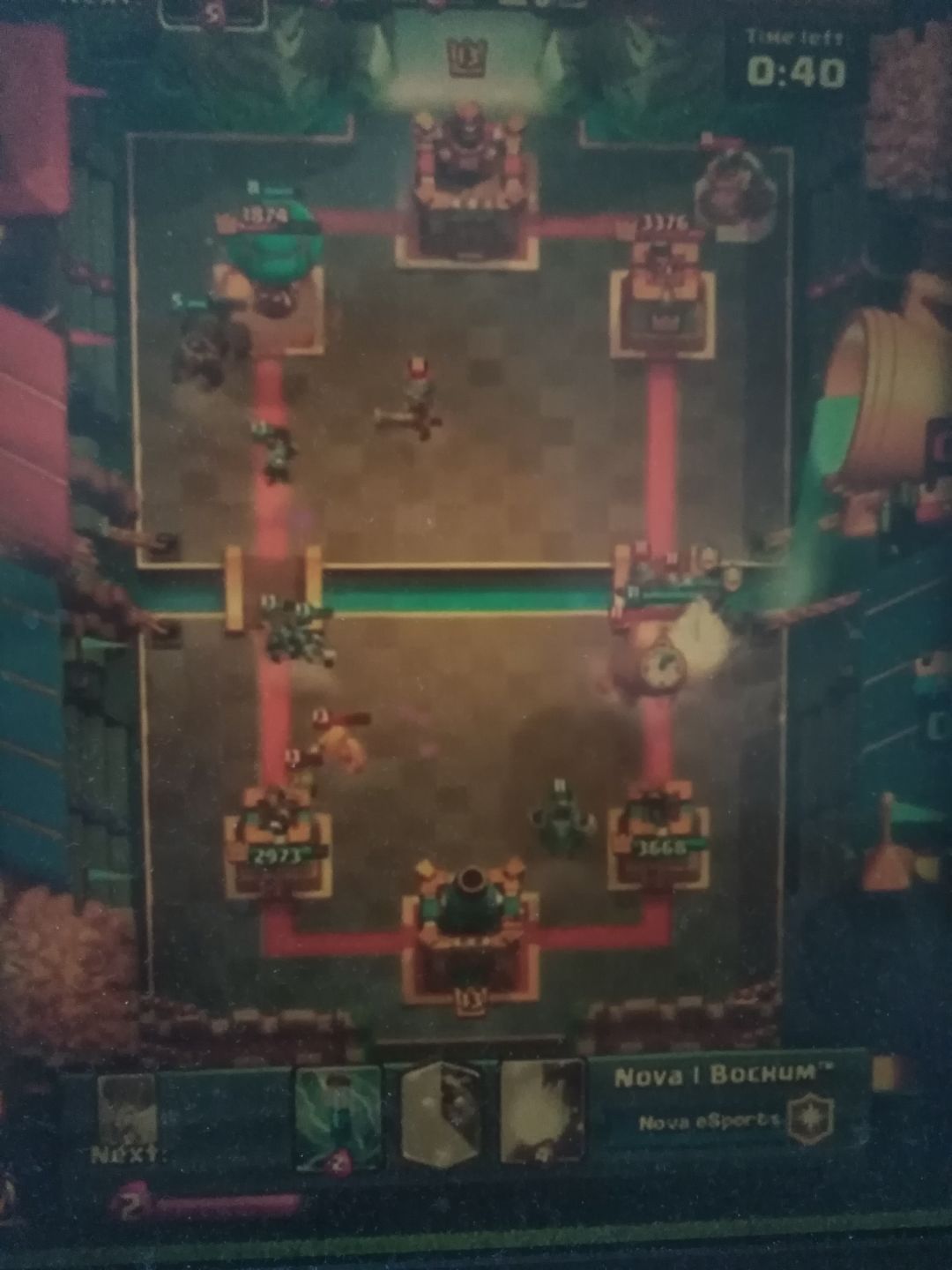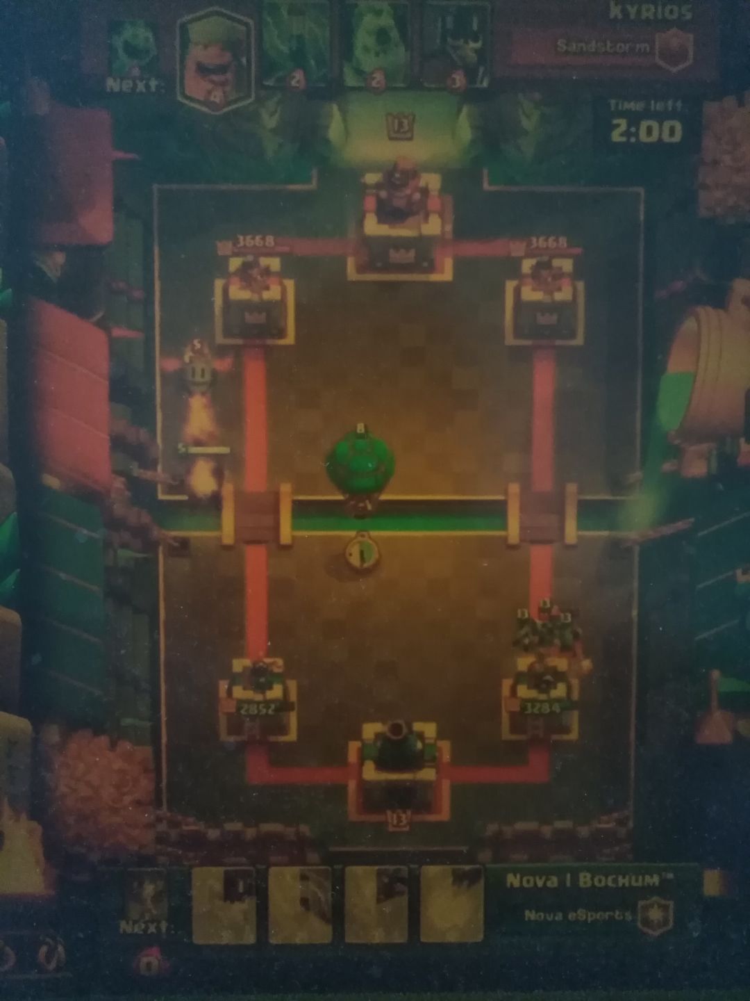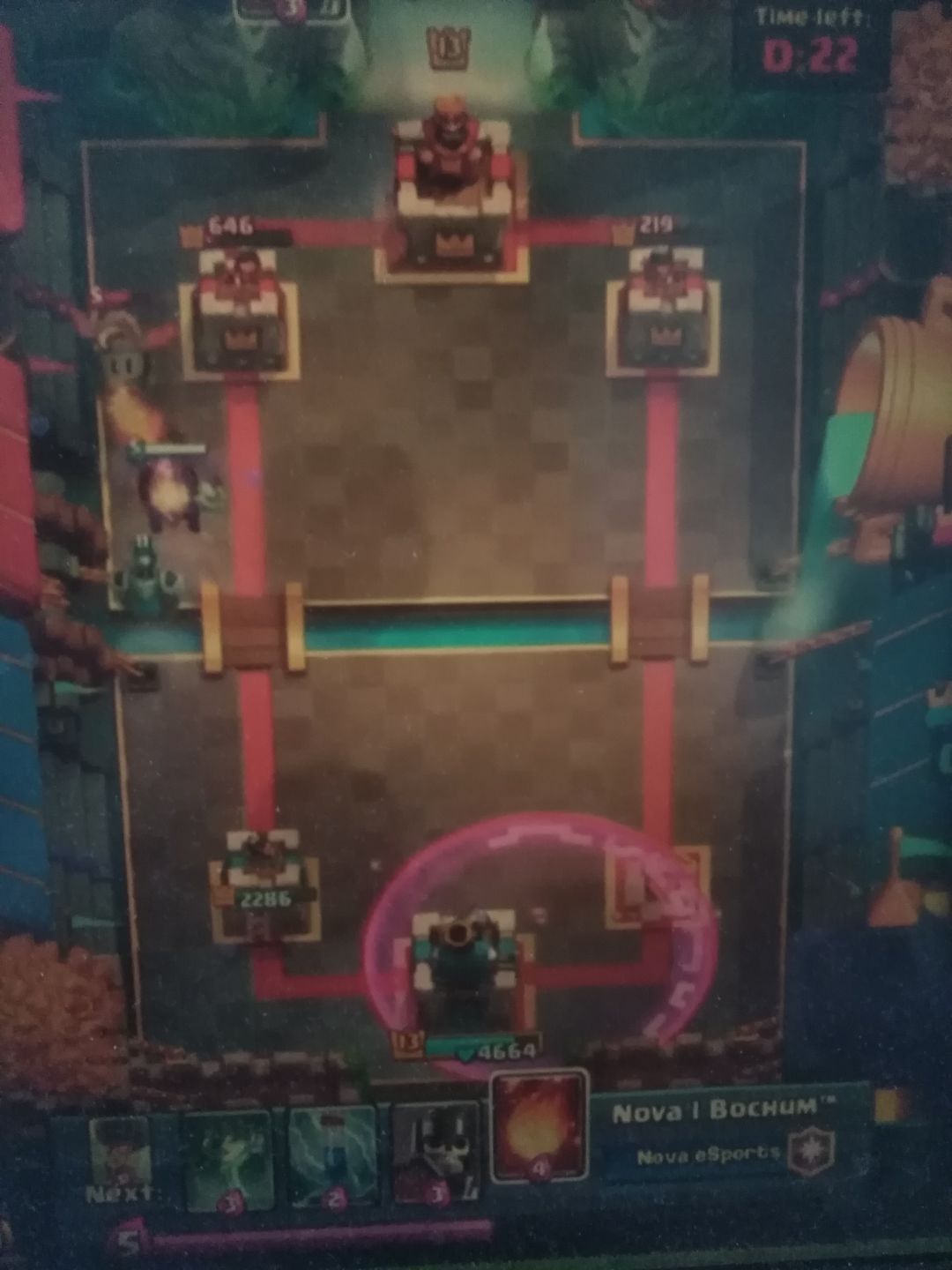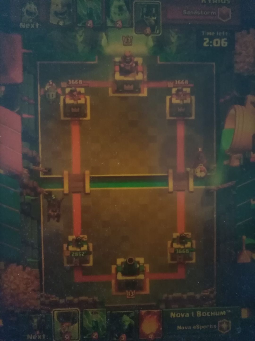 A:盾卫和野猪吃到了狂暴,公主塔只剩628滴血了。现在准备双倍了,你准备……
