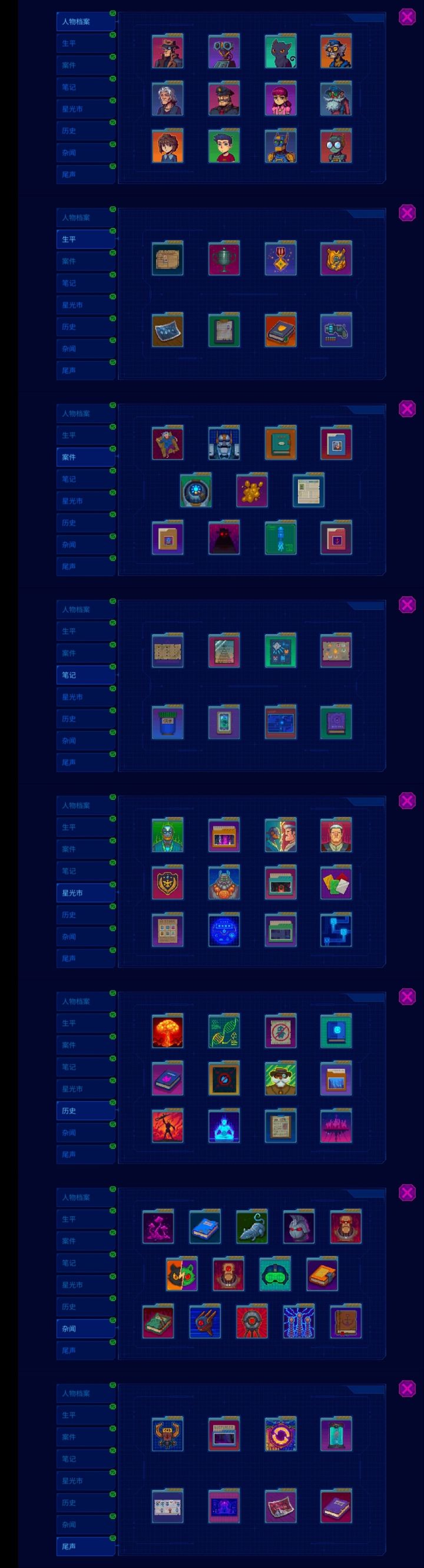 ① 体检(档案),(左红书柜生平)(右画框笔记)(右餐桌星光)出卧室上楼进入工作间。往右拿配电箱钥匙,对话机器人后下楼434修电箱。回工作间,查看铠甲(左地面历史)后去卧室洗手间拿双手剑给铠甲(档案)(铠甲杂闻),对话机器人(档案),左查看接驳台,右查看箱子对照表(笔记)0433开绿柜拿拆解器。去一楼进会客厅,往左(壁炉奖杯生平)查看书架(历史)顶层,对话黑猫带他遛弯拿处理器,进厨房右拆洗衣机拿译码器。回工作间给机器人安配件,接驳台234142313调试。一楼左出门(星光),往右(海报历史)进维修店.右柜台召唤老板(档案)(机器人杂闻).左查看货架,出门。左(海报星光)进小巷,右查看垃圾袋(档案),扫描老人合成线索,移走红垃圾箱查看地面,跟随脚印,左拿猫粮引走胖猫,查看绿皮巷和地面,组装齿轮还原事件(案件)(档案)。对话小朋友后进公寓(海报星光),进电梯上三楼,303室门锁大3左小3左.小3下下右.大1上小3上.小1左下左上.大3右小2右下.小3上右上开门进入。客厅右柜子日记本,扫描左机器人合成线索(案件).调查沙发茶桌.扫描蜡烛合成线索,对话警官去下个房间,餐厅4132点亮猫壁灯拿礼物钥匙,查看客厅日记本(案件),0421打开餐厅左柜查看日程,组装齿轮回溯事件(案件)。出门对话警官,回客厅打开机器人头(案件),给小女孩礼物(星光)(档案)。对话黑猫,黄毛层室内对话蓝猫拿控制杆(大黄杂闻),出去推鱼缸破坏电箱,上楼红黄绿调整灯牌前往对面,会话厅对话白猫311542'644531弹钢琴拿小球,出去升降梯下楼对话黄毛后进屋给红桶猫小球,右出窗进楼后、下楼拉工人下方操纵杆1号进入红窗、(左书堆历史)右拿猫薄荷后上书架(蓝书笔记)进通风口、进管道到工人旁拿玻璃纸、工人下操纵杆全拉上后下楼发现黄猫给他看玻璃纸、回室内,红桶上烤猫薄荷给右柜里猫并给他看玻璃纸,出窗上楼进会话厅给大黑看玻璃纸并给教父看一看、壁炉里拿操纵杆,出窗下楼对话大黄,回楼后给03机器安操纵杆到楼最下对话木通屋占卜猫后往右(地面书历史)从管道上去,进胖猫右管道,(绿猫历史)抓断楼顶电线放狗,拿到蜡烛。往右看看维修店后从左红灯牌打车去餐厅,往左对话(洗手间前历史)便衣警官后去洗手间,对话机器人(顺便帮助下左女士)后洗手出去,(跟左绿帽玩21点历史)听听右边绿头说话后从员工通道进仓库,右猴头下上下上下点牙拿气泡水塞进门旁拿钥匙开柜屉、调整钟表12'9'5拿气泡水放左酒柜、11'4'9和3'5'7拿到另外两瓶、酒柜拿到空瓶后往右从木通接酒放回开启机关、进密室给机器联网(历史)。