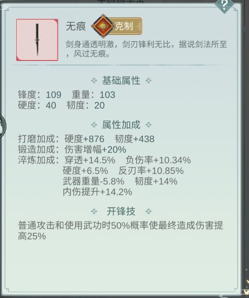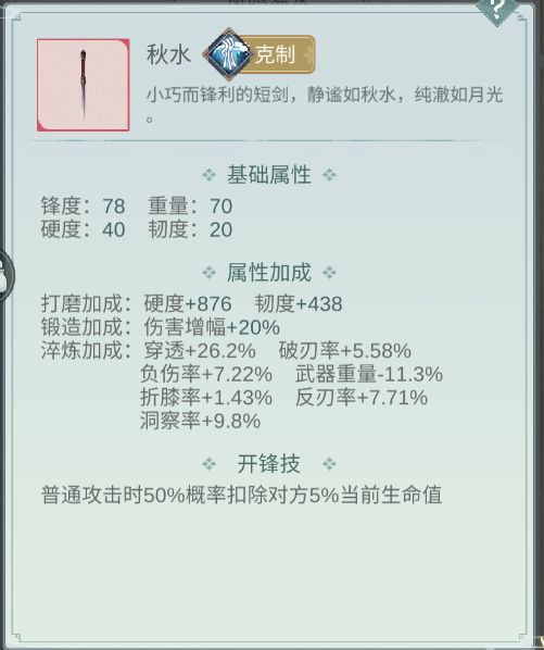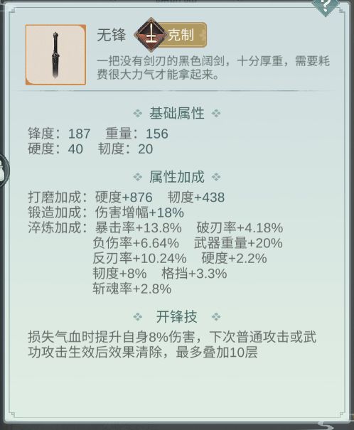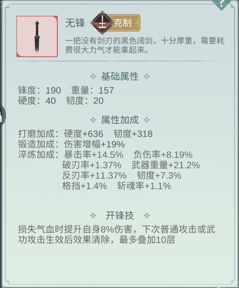 锟铻:理论武器,大家别入坑现在,感觉不会错。无器魂有器魄理论是外功武器,但是觉得可以打大招流,而且,我感觉帷幕如果在一半血以上打,打到一半血以下的话估计开封技是算加成的,还有就是,秋水玩的人真的少,环境真的好