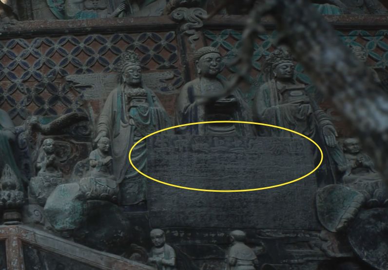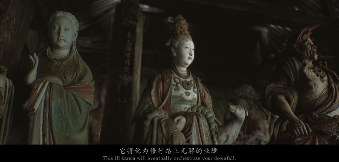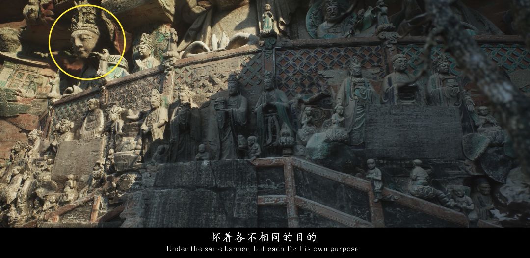 同时我们可以看见,群像右边的石壁上刻着“......上品中生”。这里对应着佛典用语“九品往生”,表示念佛人的智慧功德有深浅的不同,也呼应着下方字幕的“怀着各不相同的目的”。