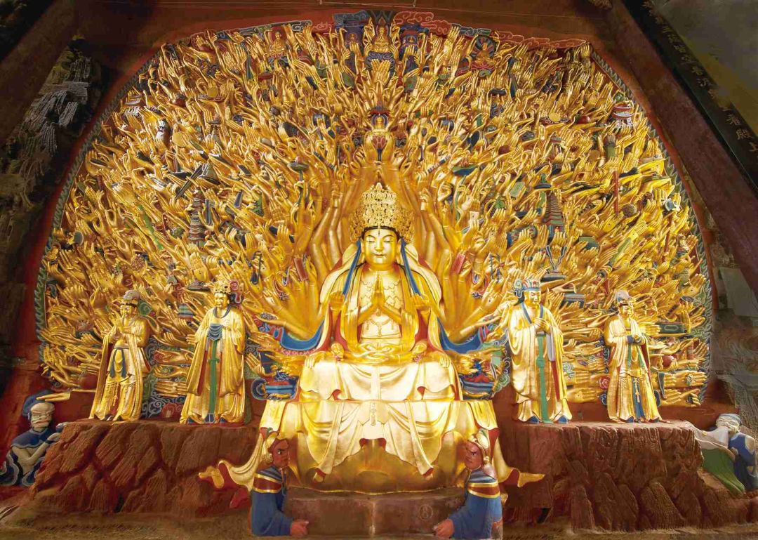 这就更好认了:这是大足石刻最标志性的千手观音像,开凿于南宋,是我国现存最大的集雕刻、贴金、彩绘于一体的摩崖石刻造像。