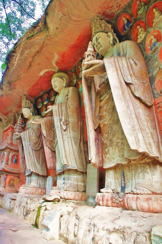 左上角的这个佛头十分显眼,从这张清晰的侧面,很容易能判断出这是重庆大足石刻的摩崖石刻。