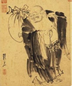 猩猩、猿猴在佛门中的寓意是愚痴躁动,不入护法队伍;猿戴着的面具状如夜叉,夜叉又分为两种,一种是在佛前皈依三宝成为护法,如果没有皈依,就是食人鬼。结合后面猿与猴子缠斗的情景,应该是指后者。