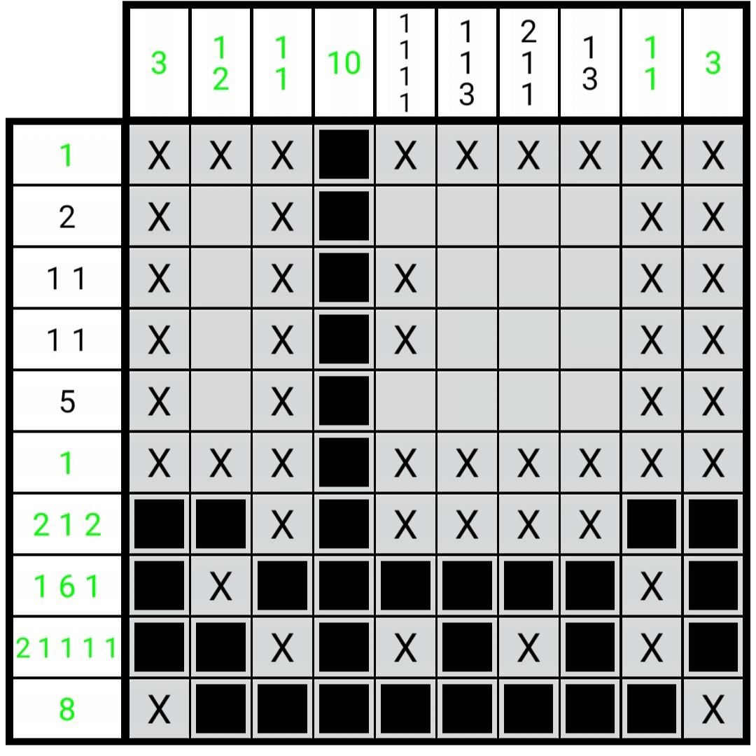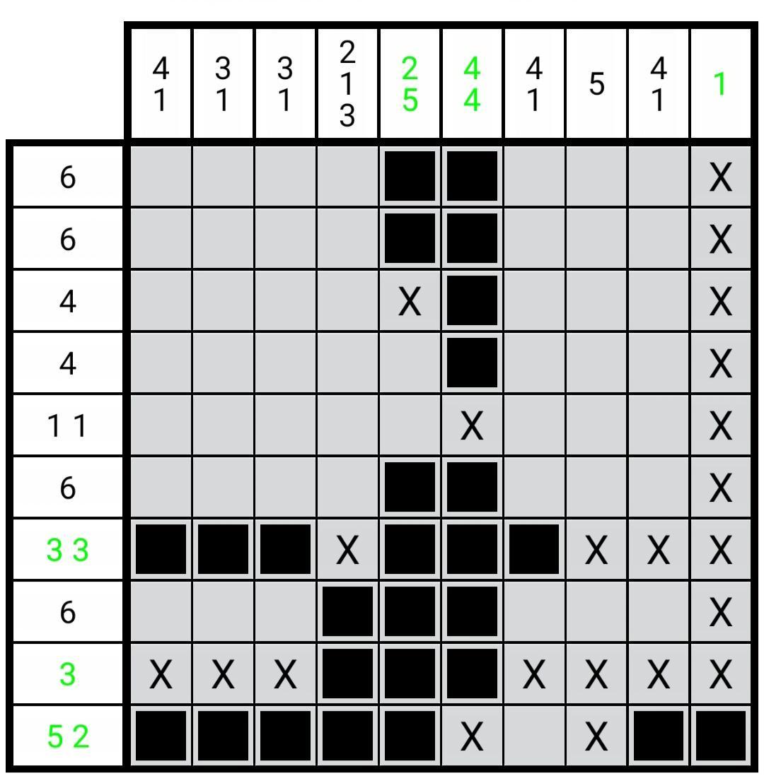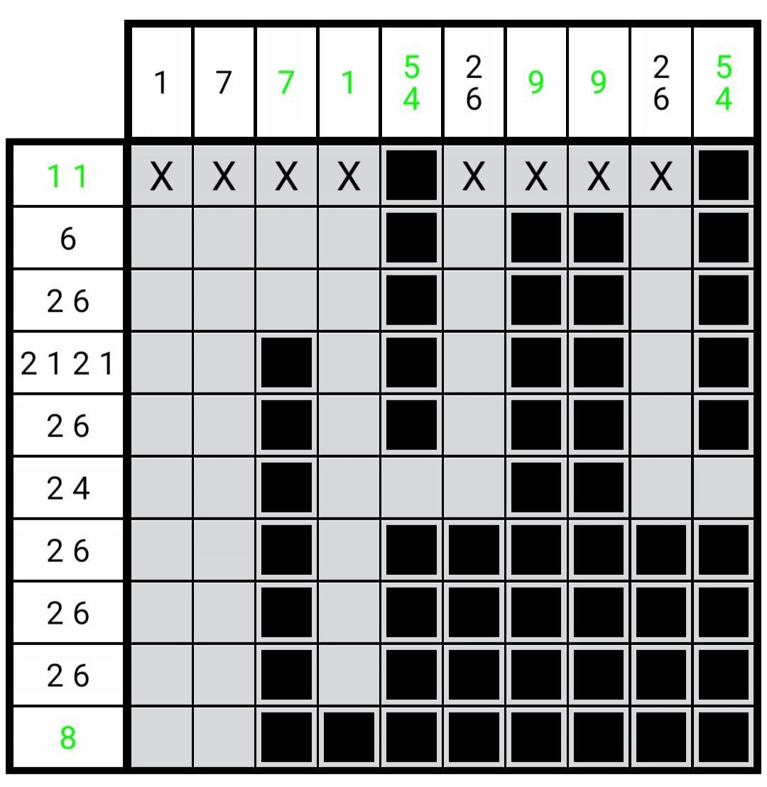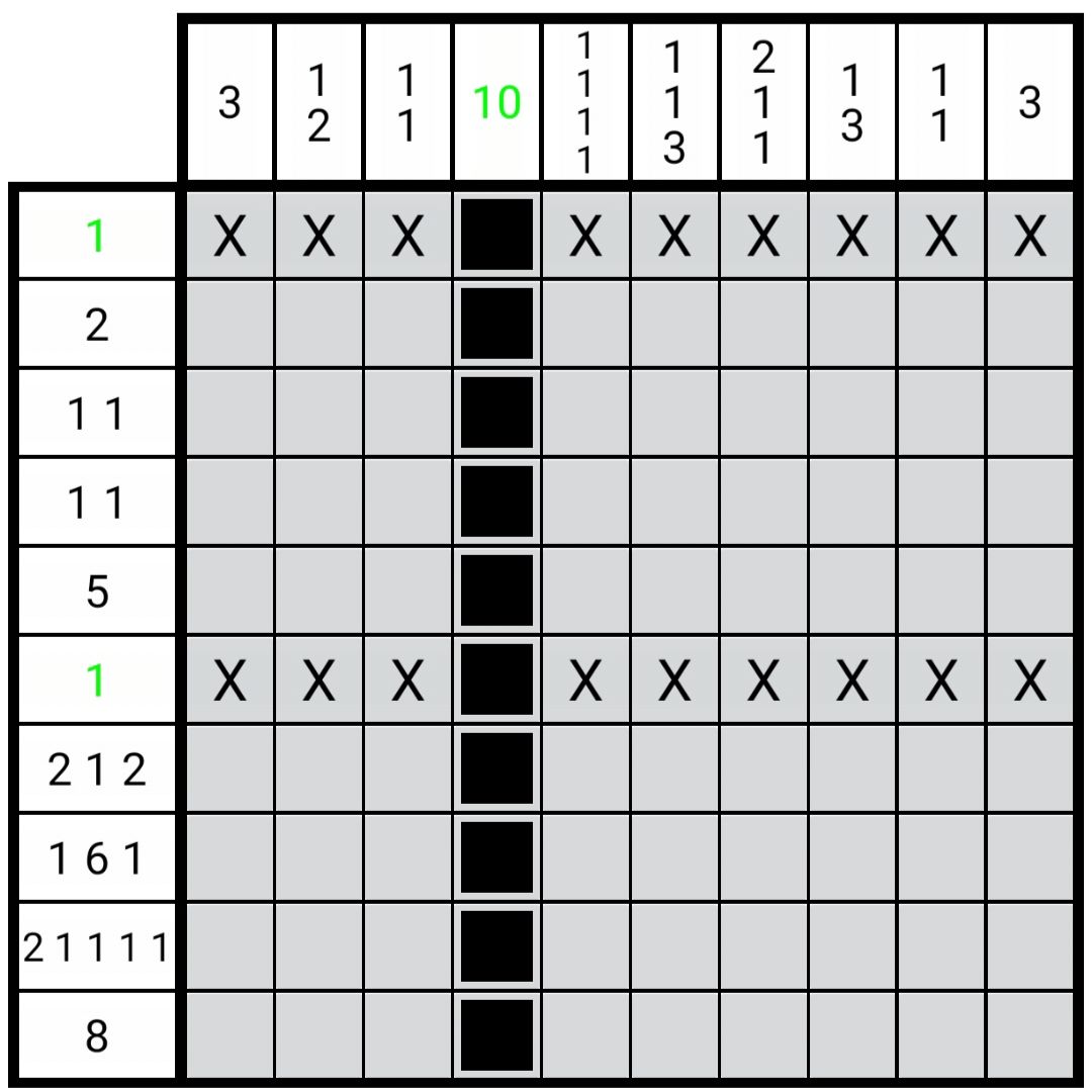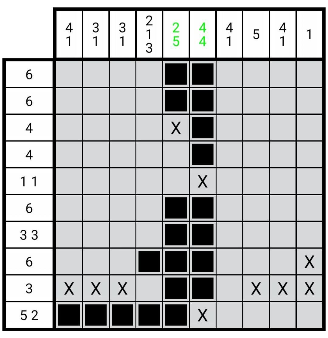 如图2.4.1所示,在这种情况下,定理(2.2.3)无法确定第7行第9列的负格,但是经过很简单的推演,我们就可以很容易确定其为负格。这种情况和图2.2.2极其相似,就连推演步骤都一样。我们不能对于每一种情况都创造一个新的定理。不然对于无限大的区块我们就要提出无限个定理,这显然是荒缪的。