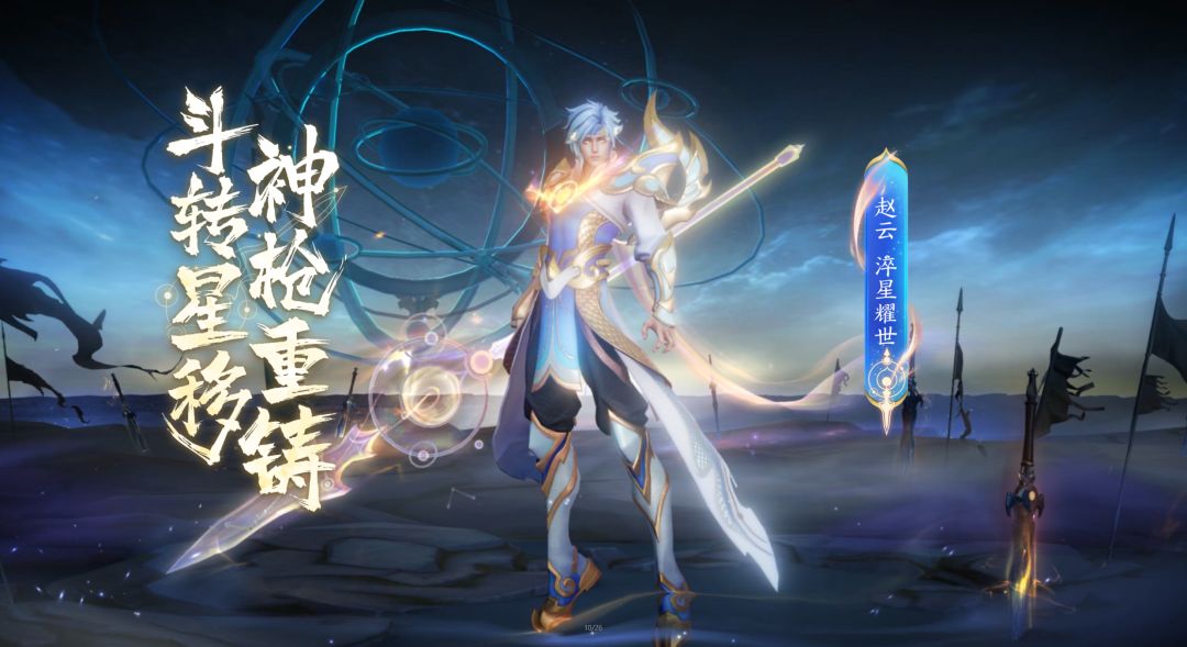 【角色形象设计】围绕“星宿、星君”的设定,结合世冠“淬炼、无双”的主题:采用了古代星图、星轨元素;根据浑天仪解构出了星君背后抽象化的龙角环绕星轨的视觉表现;铠甲中的火纹彰显淬炼、断枪重铸的意象;龙鳞纹也与英雄赵云的“子龙”相呼应