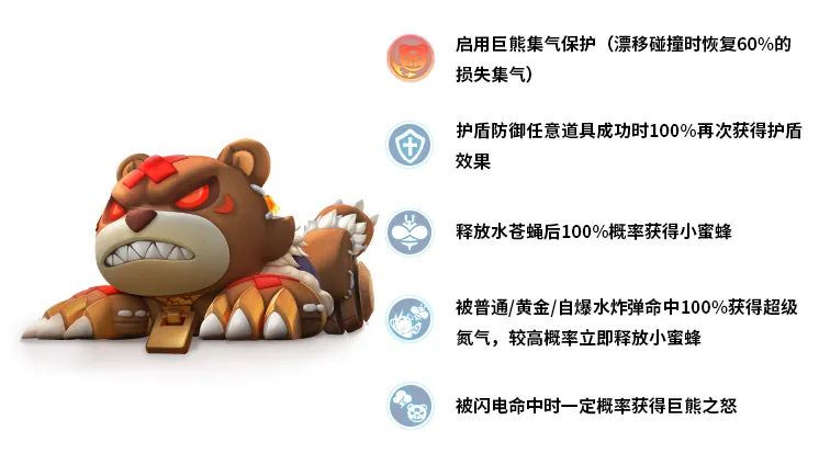 被普通/黄金/自爆水炸弹命中时,巨熊会100%获得超级氮气并且还有较高概率立即释放小蜜蜂进行反击!轻易攻击巨熊的代价是惨重的,不但要立刻承受巨熊的蜜蜂威胁,还不能阻止巨熊快速冲上来找你麻烦。