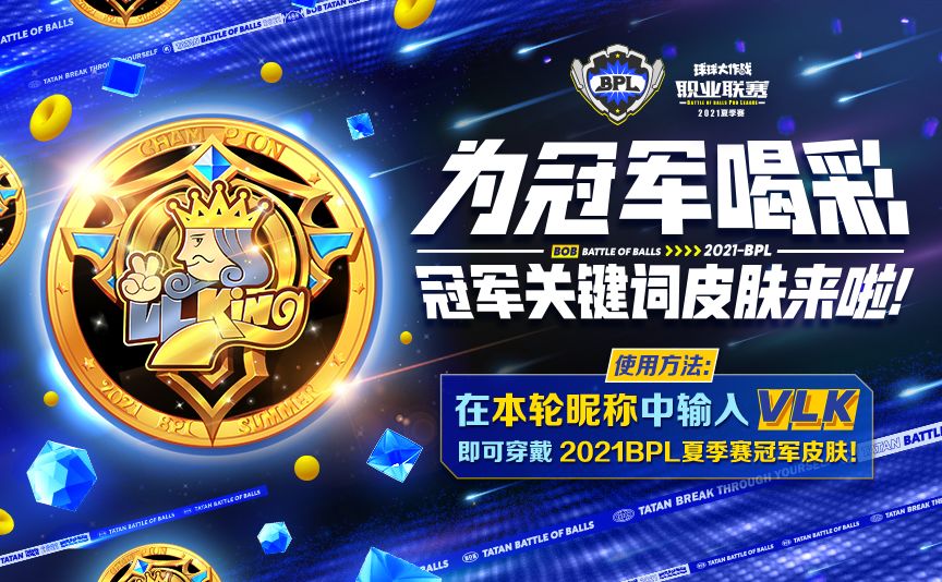 露菲菲觉得这个金色和VLK的队标好合拍哦!不愧是Victory Like King!只要在本轮昵称中输入VLK,就可以穿戴2021BPL夏季赛冠军皮肤啦!快穿上新皮肤,在游戏里一同享受胜利的喜悦吧!