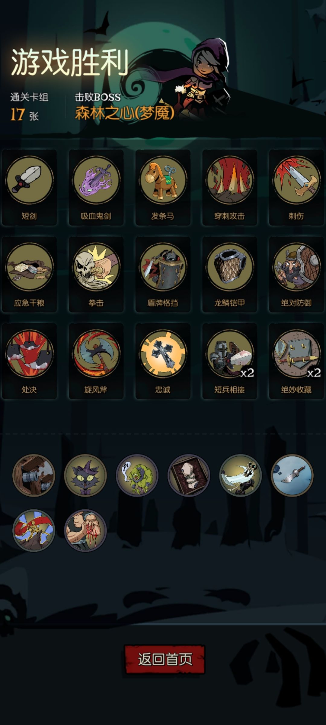 四张攻击牌不能多,可以拿适当的行动牌配合祝福度过第二,三章那些难打的怪比如赌徒,船长,无头骑士等当然实在打不过就跳过直接刷boss进第四章(因为没凑齐完整牌组前战斗力太弱)